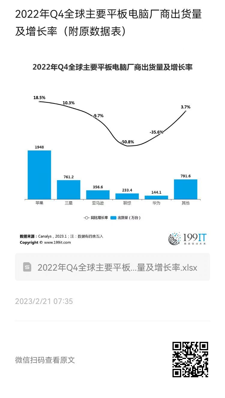 - 2023年Q1全球主要平板电脑厂商出货量及增长率(附原数据表)
