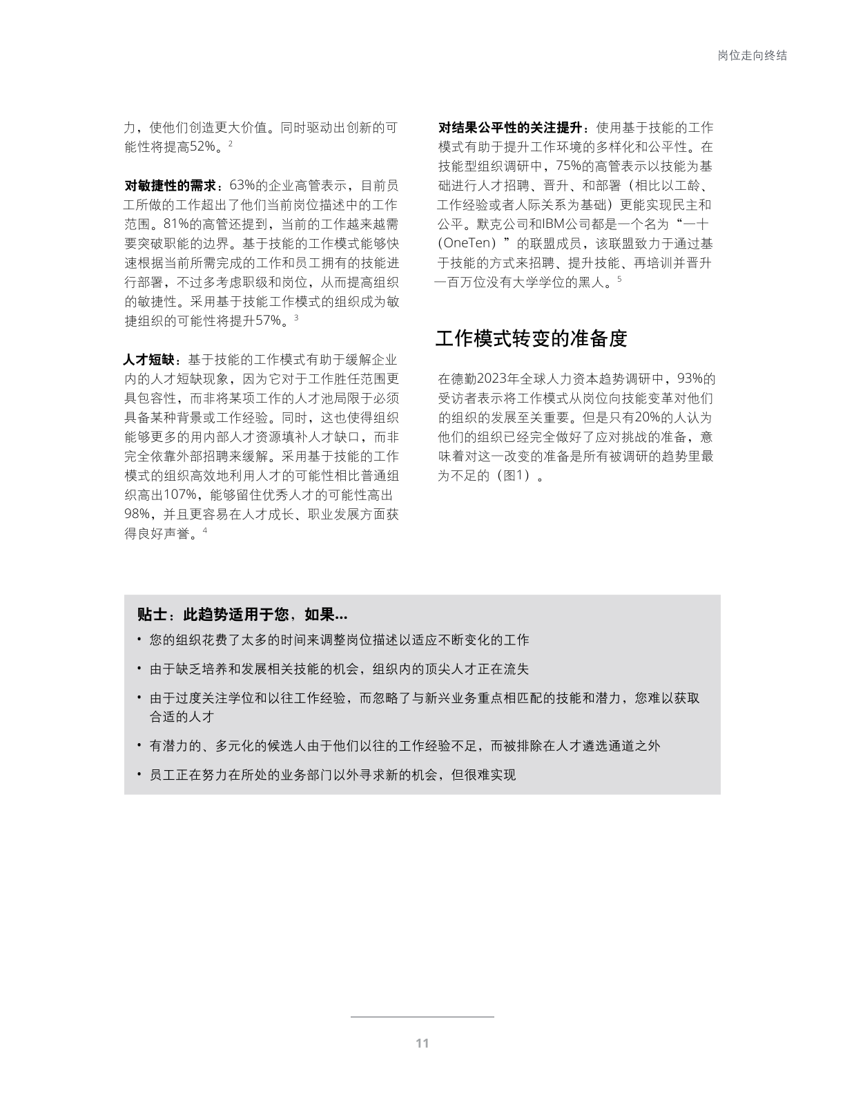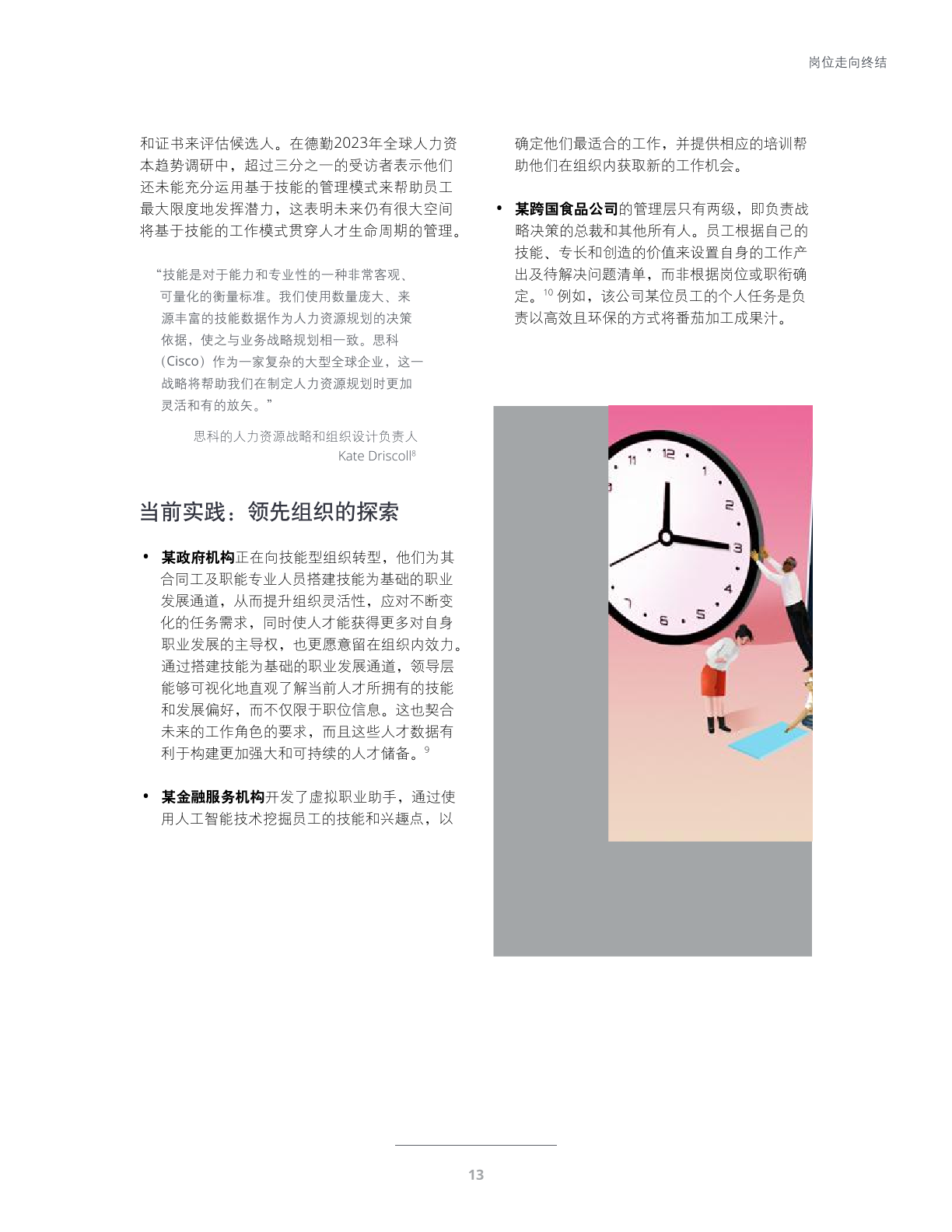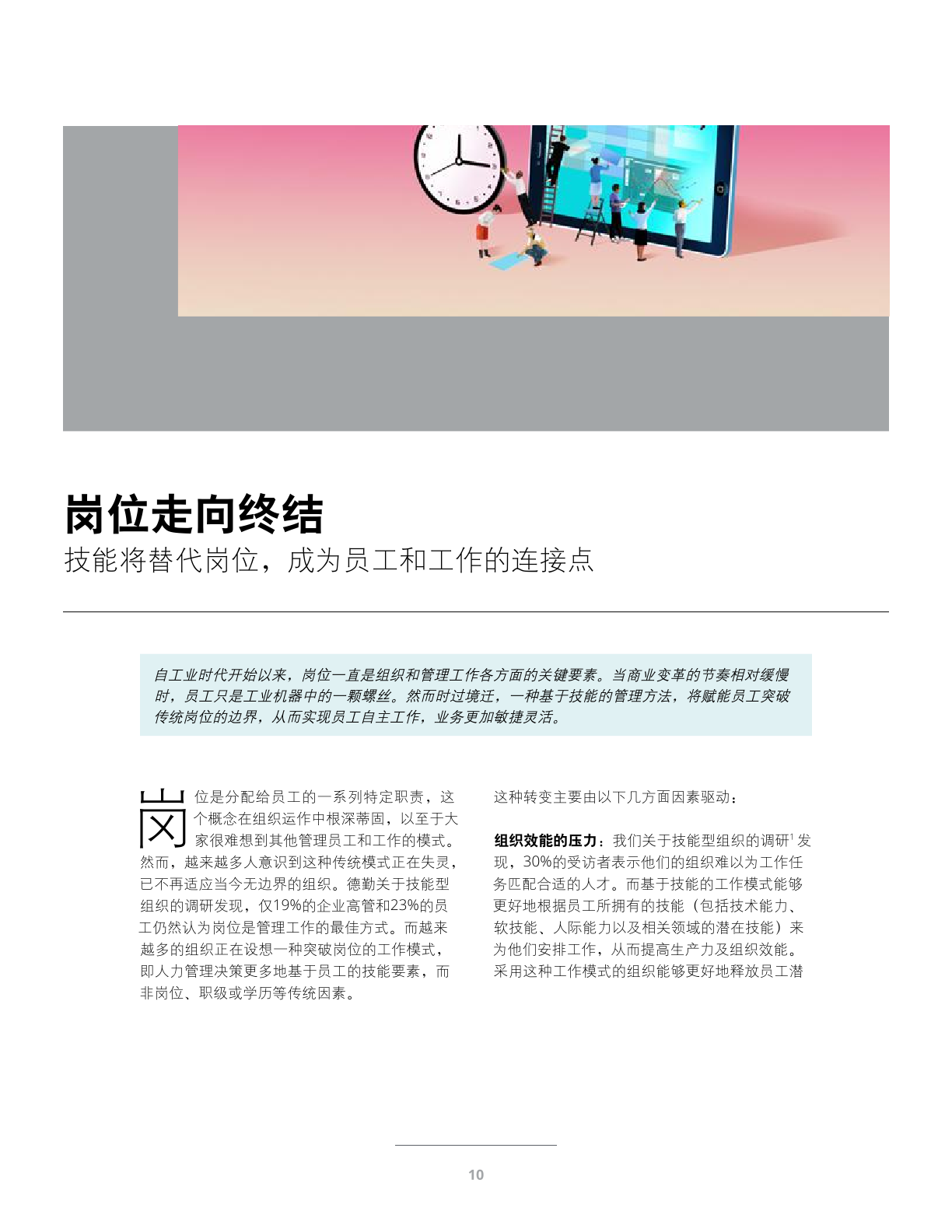 岗位走向终结。划分工作与工作之间的界限、划分任务类型、以狭窄的角色和职责范围定义员工,这些因素都限制了组织的创新和敏捷性发展。许多公司正在尝试用技能而非岗位作为劳动力决策的基础。当员工从岗位中被解放出来,员工就能更好地发挥出他们的能力、经验和兴趣,以促进组织和员工的发展。