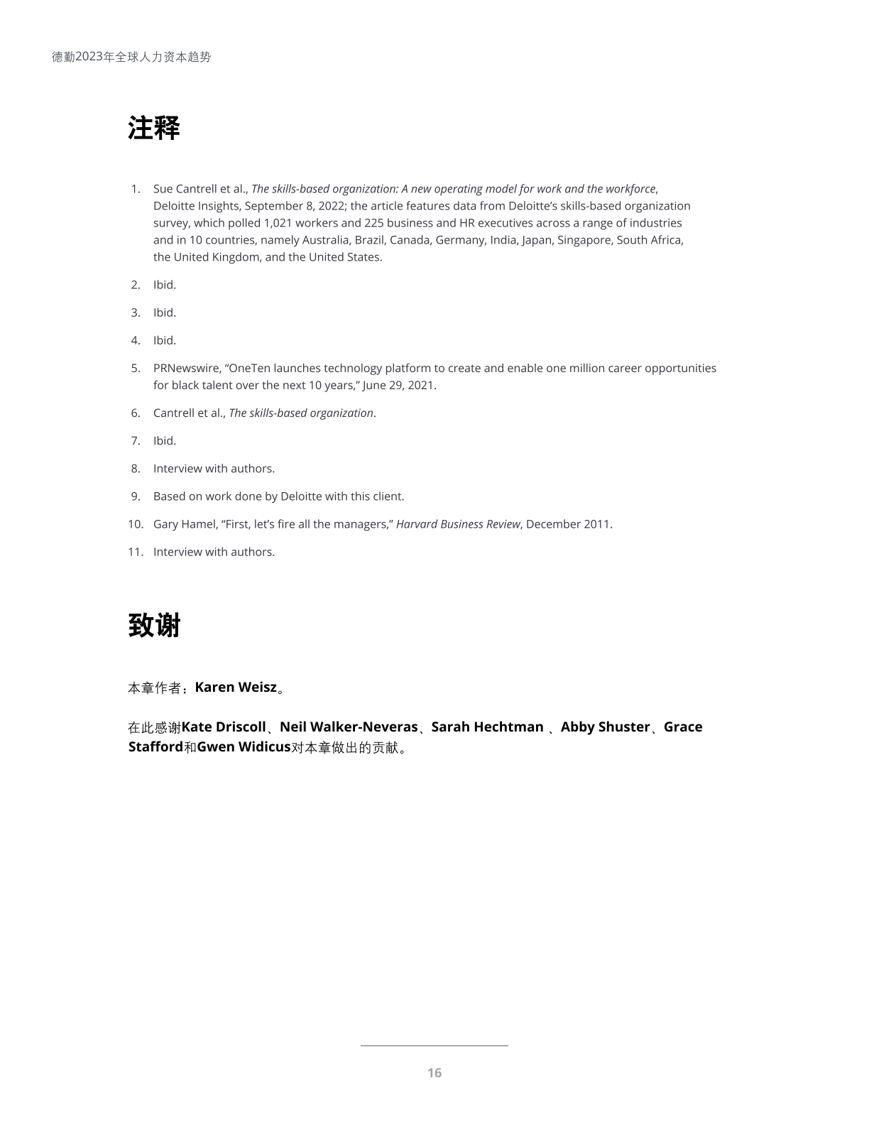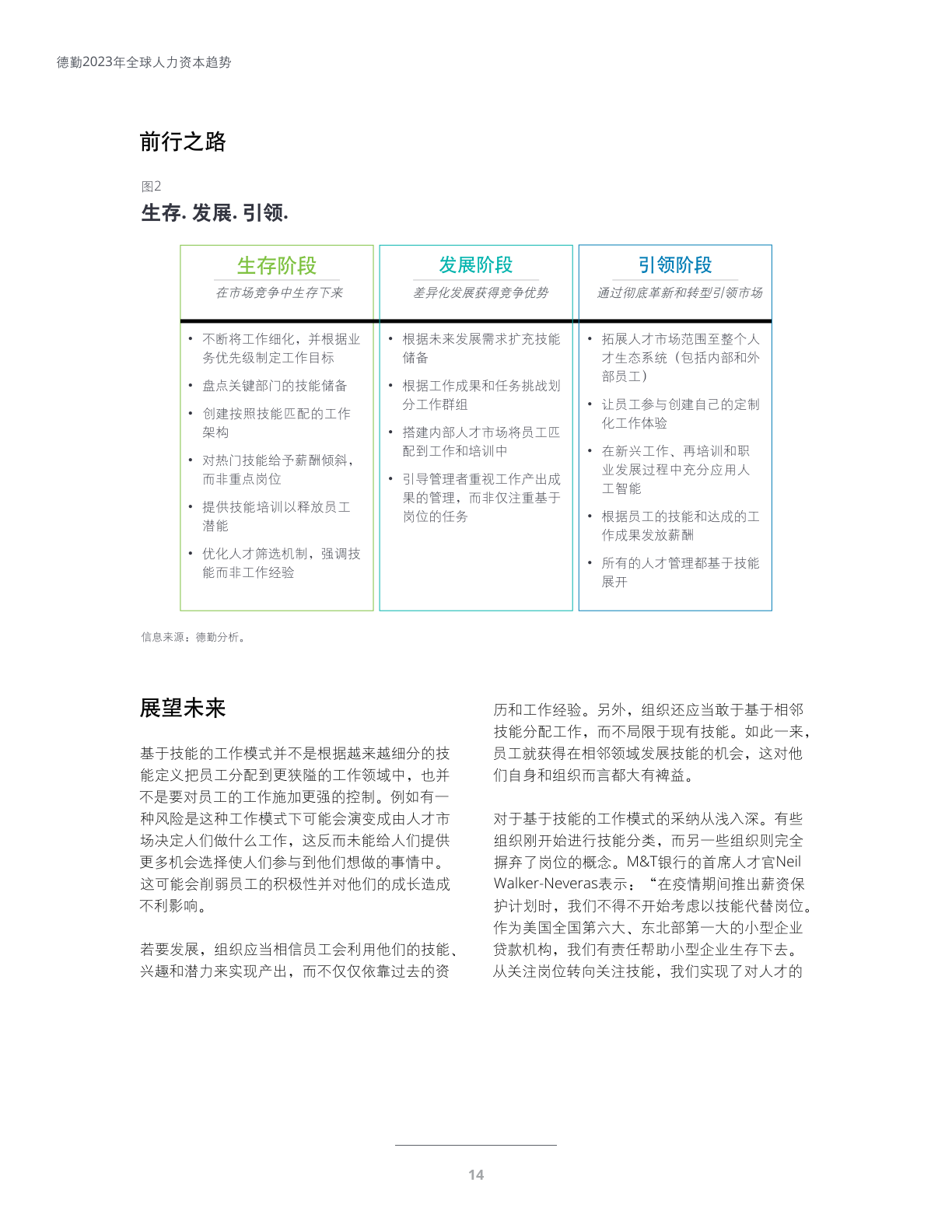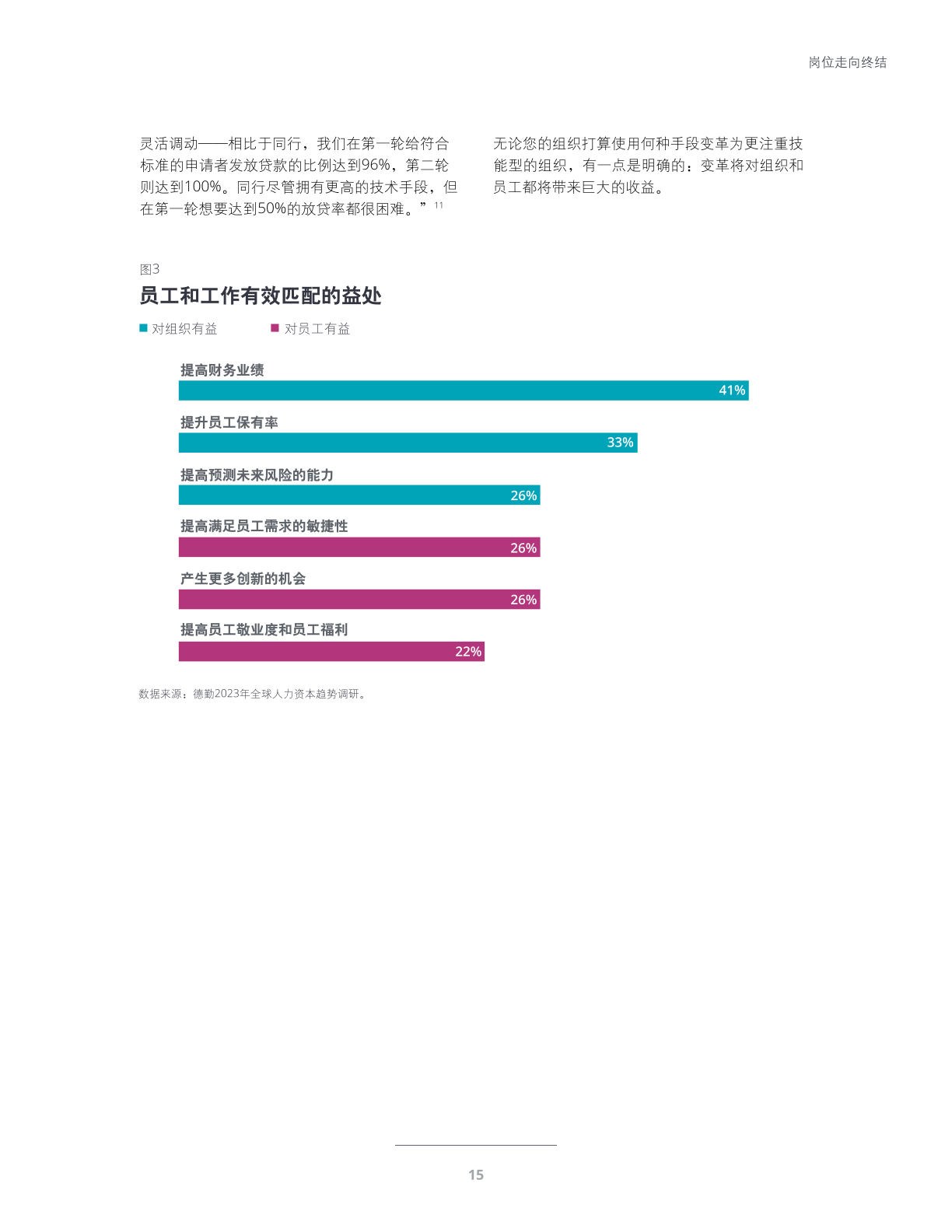 岗位走向终结。划分工作与工作之间的界限、划分任务类型、以狭窄的角色和职责范围定义员工,这些因素都限制了组织的创新和敏捷性发展。许多公司正在尝试用技能而非岗位作为劳动力决策的基础。当员工从岗位中被解放出来,员工就能更好地发挥出他们的能力、经验和兴趣,以促进组织和员工的发展。