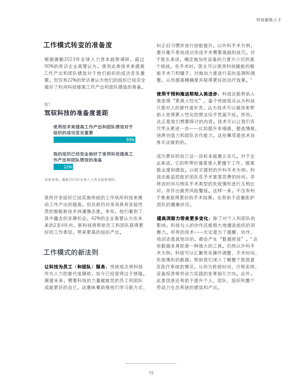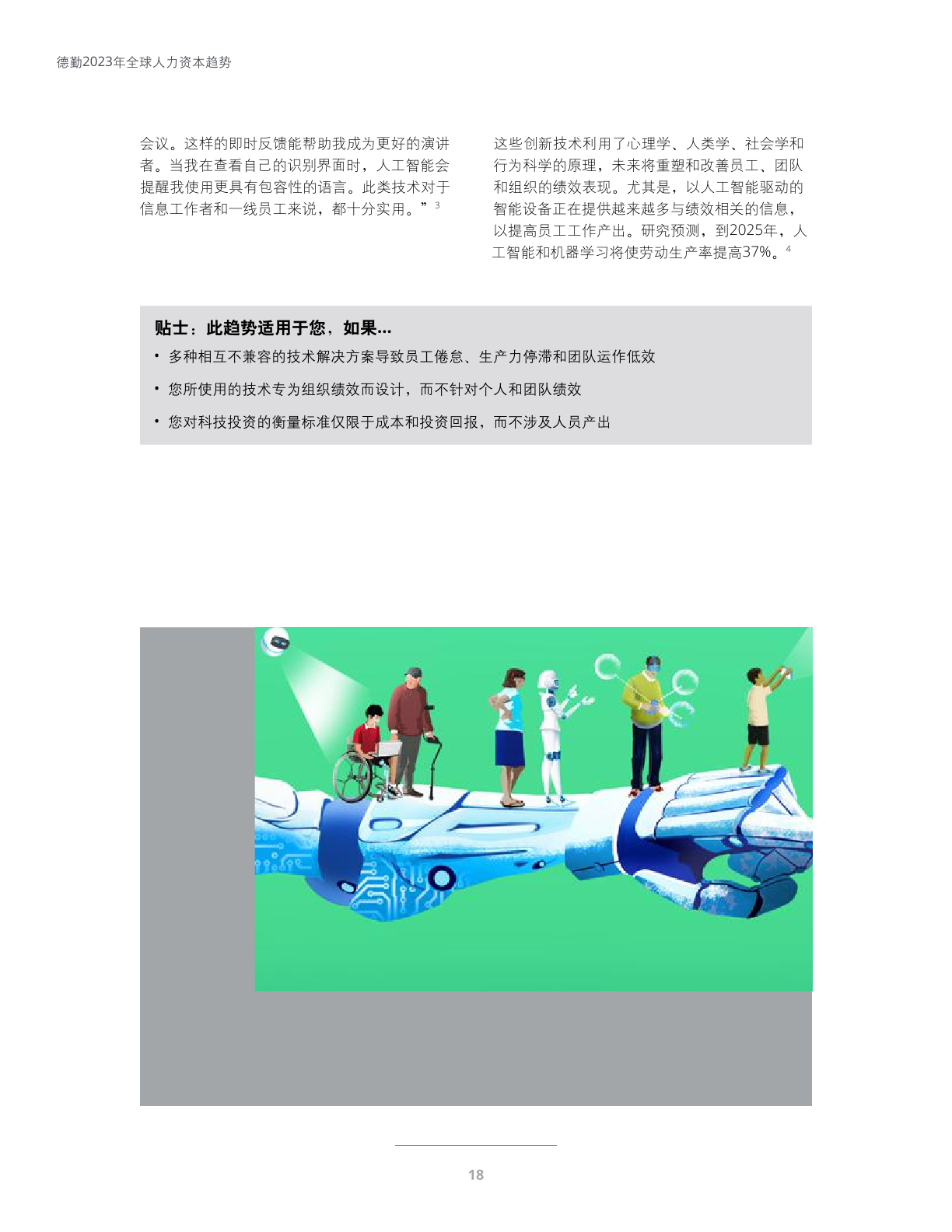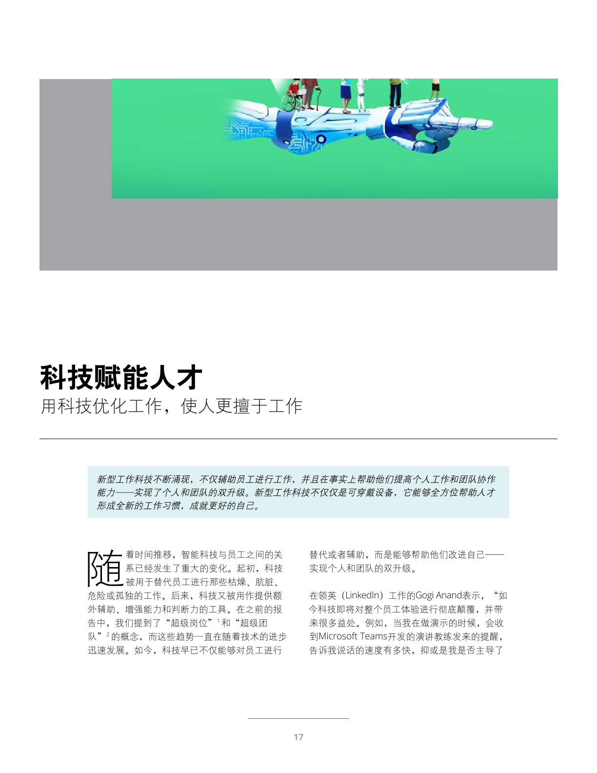 科技赋能人才。工作场所不断引进新技术,人工和技术之间相互独立的边界正在逐渐消失,新技术不仅实现了自动化并扩大产能,而且还提高了团队的绩效。有远见的组织正在探索如何利用技术,既能最大化人类的独特优势,又能优化他们的工作能力。