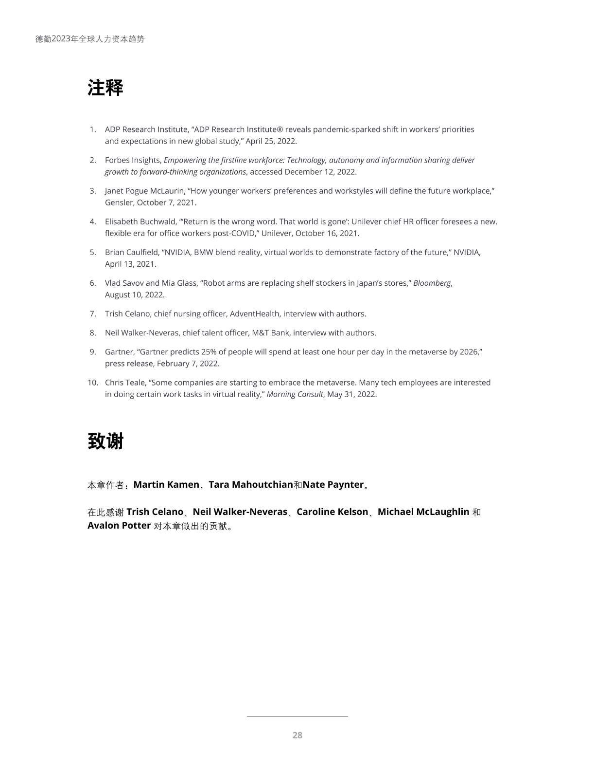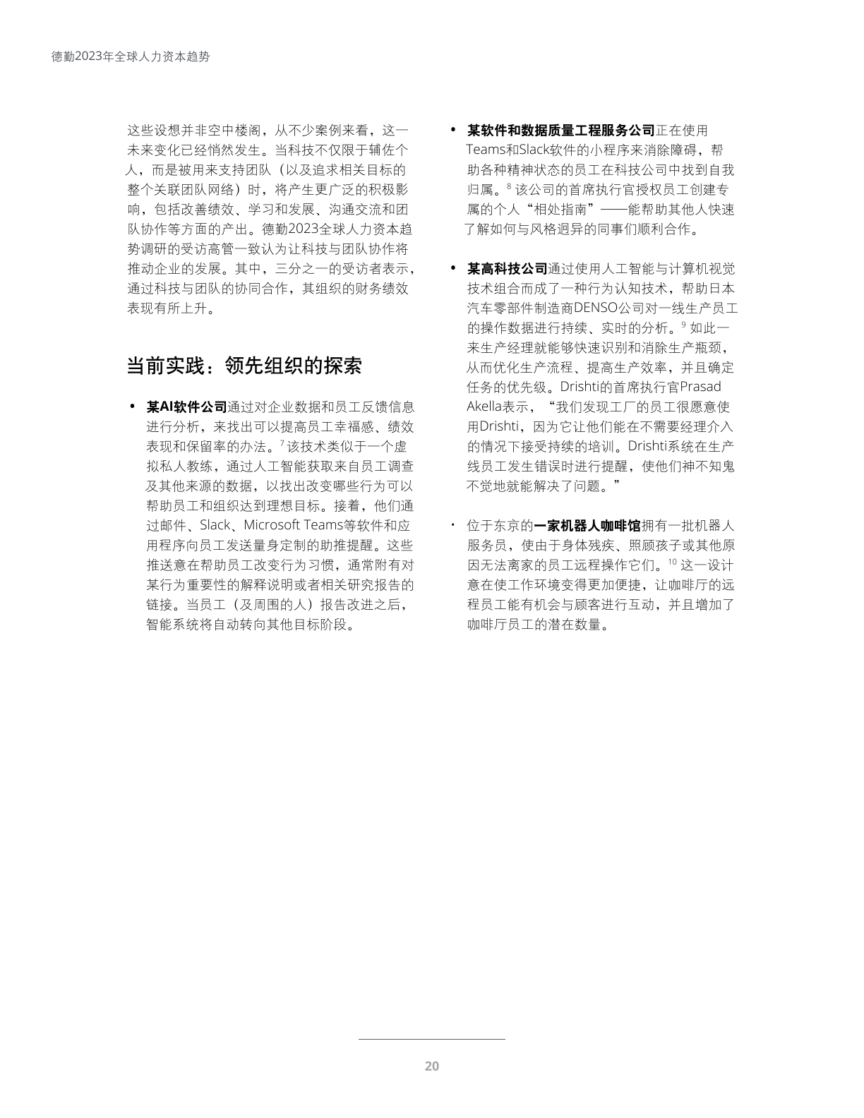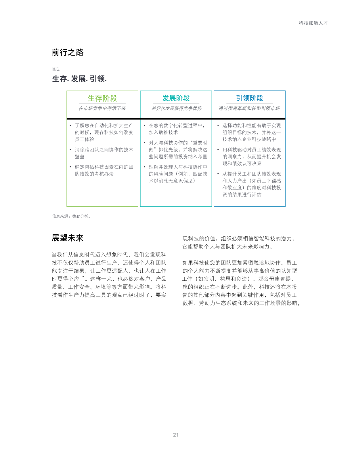 科技赋能人才。工作场所不断引进新技术,人工和技术之间相互独立的边界正在逐渐消失,新技术不仅实现了自动化并扩大产能,而且还提高了团队的绩效。有远见的组织正在探索如何利用技术,既能最大化人类的独特优势,又能优化他们的工作能力。
