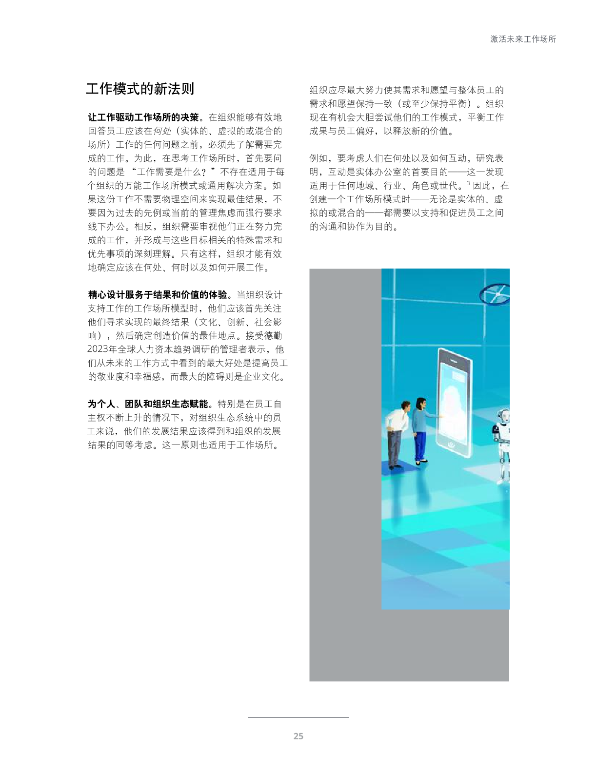 激活未来工作场所。数字化和虚拟技术的进步以及元宇宙的兴起正在重新定义工作场所,让这个概念不再仅限于某一物理空间。如今,互联性正在增强,居家办公和现场工作之间的界限越来越模糊,使得企业有机会探索“如何”完成工作,而不仅仅是改变“在哪”工作。对于工作本身和员工而言,工作地点和形式都已经不再是首要考虑。