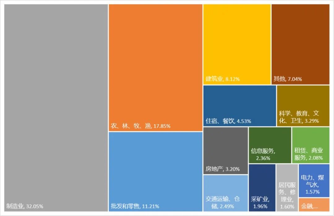 根据上述县域中小企业识别方法,从2020年中国私营企业调查数据中共识别出7710家定位为县(不包括县级市)的中小型企业。在这些企业中,主营业务为制造业的企业数量最多,占所有企业总数的32.0%(2471家)。经营农、林、牧、渔业的企业数目次之,占所有企业总数的17.8%(1376家)。主营业务为金融业的企业最少,仅占总数的0.6%(51家)。此外,有182家企业(占总数的2.4%)从事与数字技术关联较紧密的信息服务业。