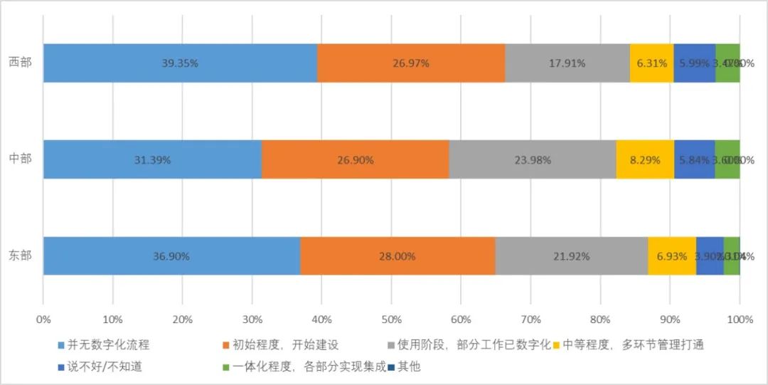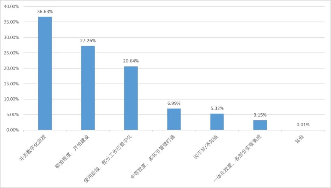企业数字化转型过程,大体可以分为无数字化阶段、引入阶段、使用阶段、融合阶段和一体化阶段。其中,处于无数字化阶段的企业或是暂不具备数字化转型条件,或是缺乏数字化转型的意识而暂未开始数字化转型。后四个阶段分别对应企业数字化转型从初始程度、中等程度、应用程度到一体化程度的不同水平。这一水平差异,主要体现在数字技术应用场景是否覆盖企业经营全链条,生产制造是否与数字技术融合实现深度信息化、智能化,是否具备基于数据分析的管控系统与决策体系等。