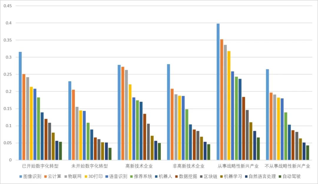 另一方面,大型上市公司与县域中小企业对数字化的关注也有差异。从上市公司报告中的数字经济词汇使用来看,移动互联网、工业互联网以及互联网金融同样是上市公司数字化关注的重点,词频权重分别为0.72、0.35与0.33。数据挖掘(词频权重0.02)、深度学习(词频权重0.011)等底层技术方案也同样在上市公司报告中得到了体现。