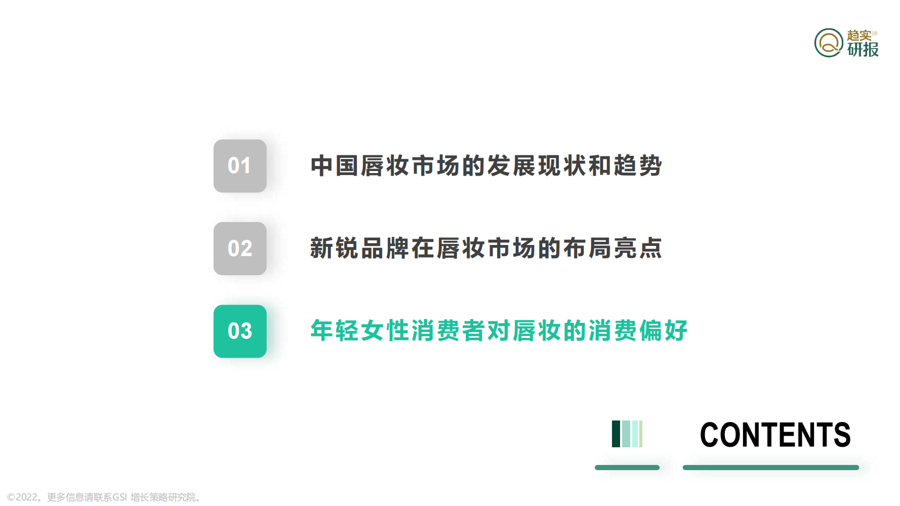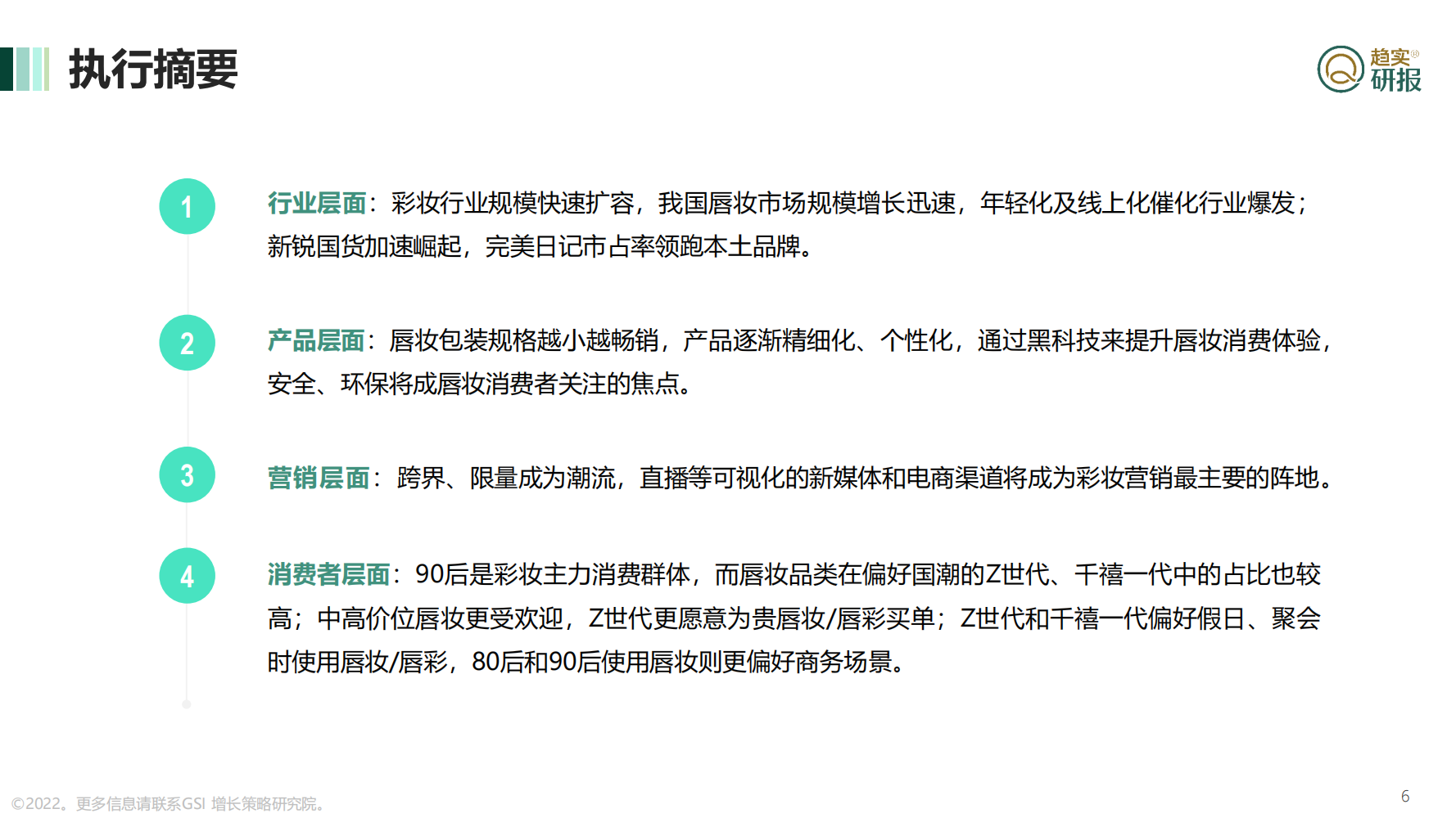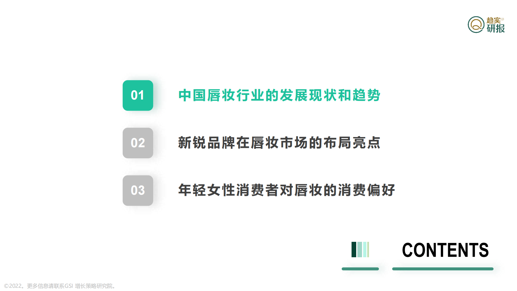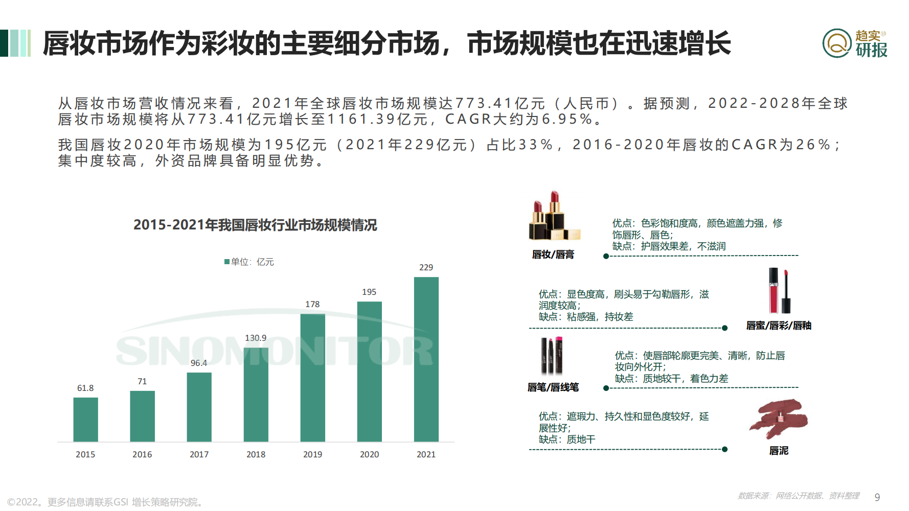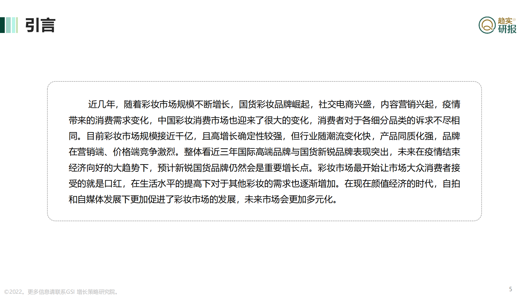 近几年,随着彩妆市场规模不断增长,国货彩妆品牌崛起,社交电商兴盛,内容营销兴起,疫情带来的消费需求变化,中国彩妆消费市场也迎来了很大的变化,消费者对于各细分品类的诉求不尽相同。目前彩妆市场规模接近千亿,且高增长确定性较强,但行业随潮流变化快,产品同质化强,品牌在营销端、价格端竞争激烈。整体看近三年国际高端品牌与国货新锐品牌表现突出,未来在疫情结束经济向好的大趋势下,预计新锐国货品牌仍然会是重要增长点。彩妆市场最开始让市场大众消费者接受的就是口红,在生活水平的提高下对于其他彩妆的需求也逐渐增加。在现在颜值经济的时代,自拍和自媒体发展下更加促进了彩妆市场的发展,未来市场会更加多元化。
