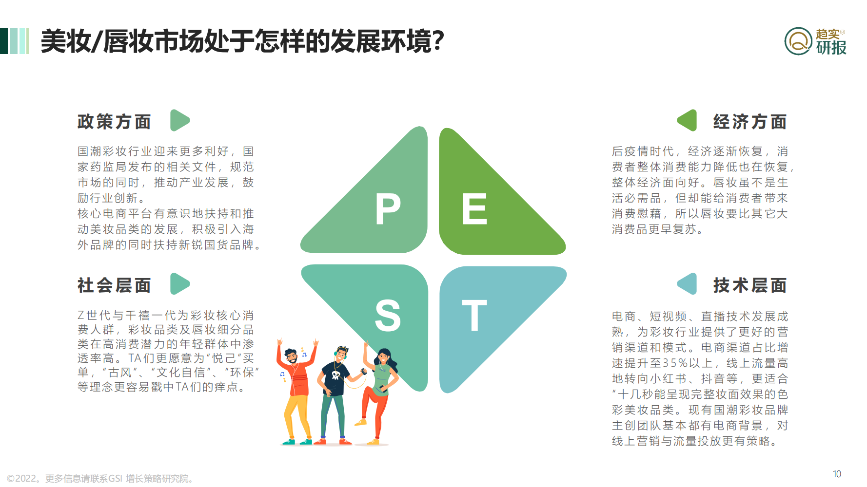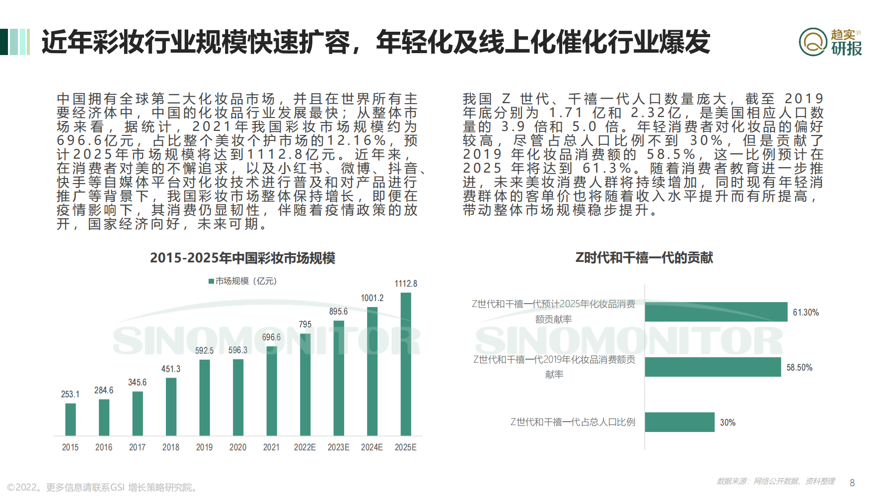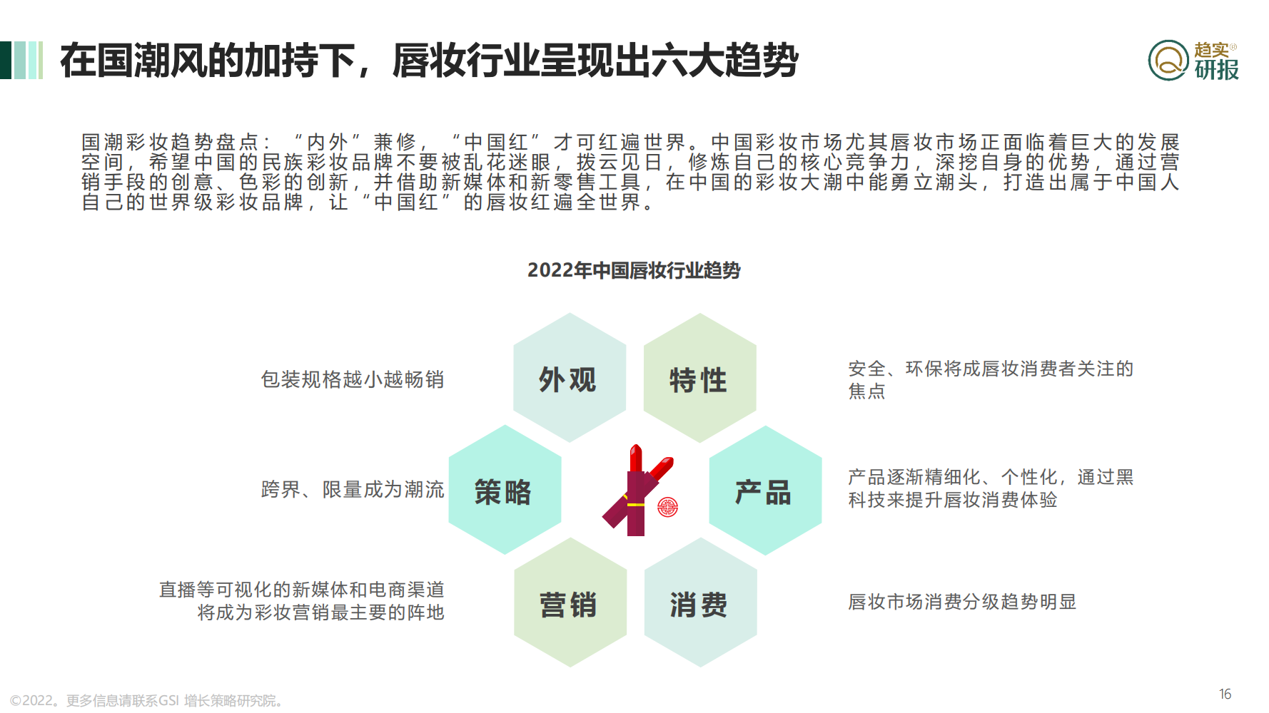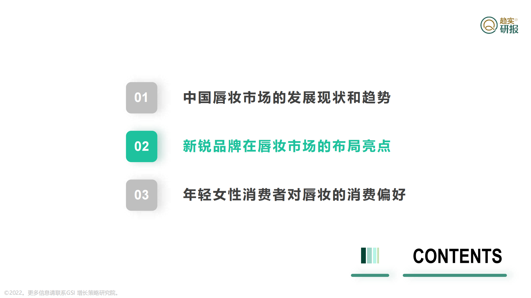 近几年,随着彩妆市场规模不断增长,国货彩妆品牌崛起,社交电商兴盛,内容营销兴起,疫情带来的消费需求变化,中国彩妆消费市场也迎来了很大的变化,消费者对于各细分品类的诉求不尽相同。目前彩妆市场规模接近千亿,且高增长确定性较强,但行业随潮流变化快,产品同质化强,品牌在营销端、价格端竞争激烈。整体看近三年国际高端品牌与国货新锐品牌表现突出,未来在疫情结束经济向好的大趋势下,预计新锐国货品牌仍然会是重要增长点。彩妆市场最开始让市场大众消费者接受的就是口红,在生活水平的提高下对于其他彩妆的需求也逐渐增加。在现在颜值经济的时代,自拍和自媒体发展下更加促进了彩妆市场的发展,未来市场会更加多元化。