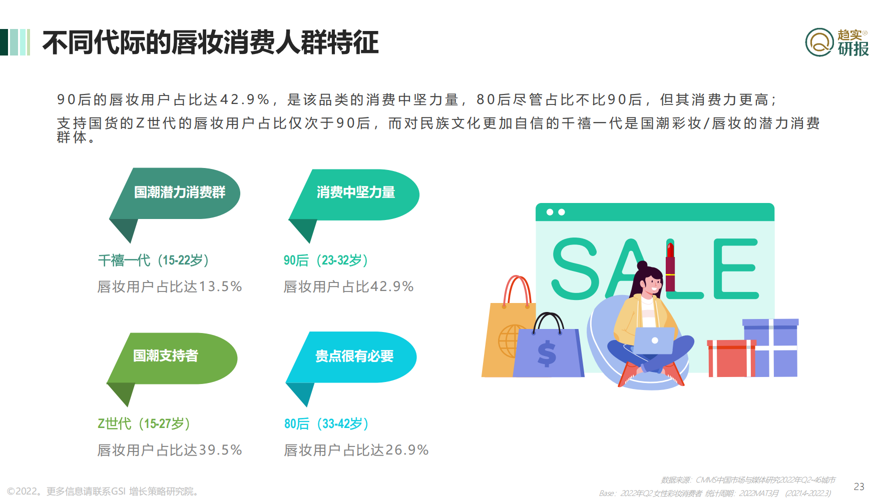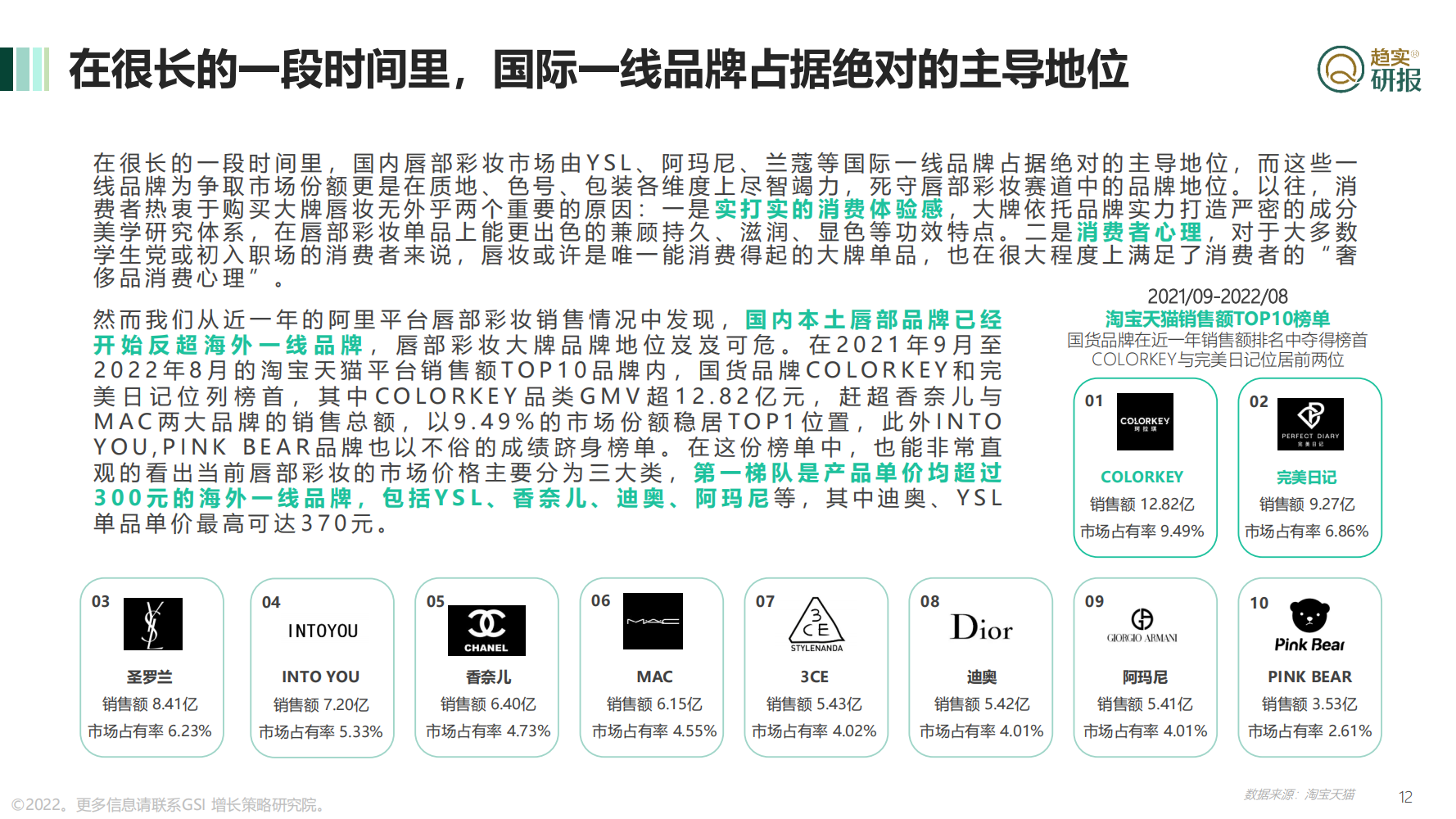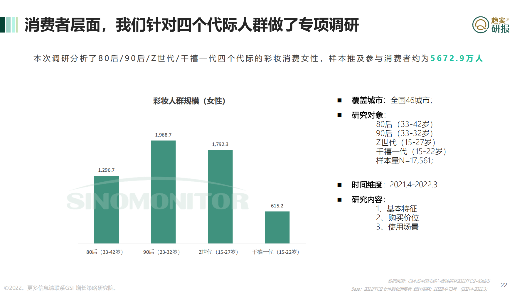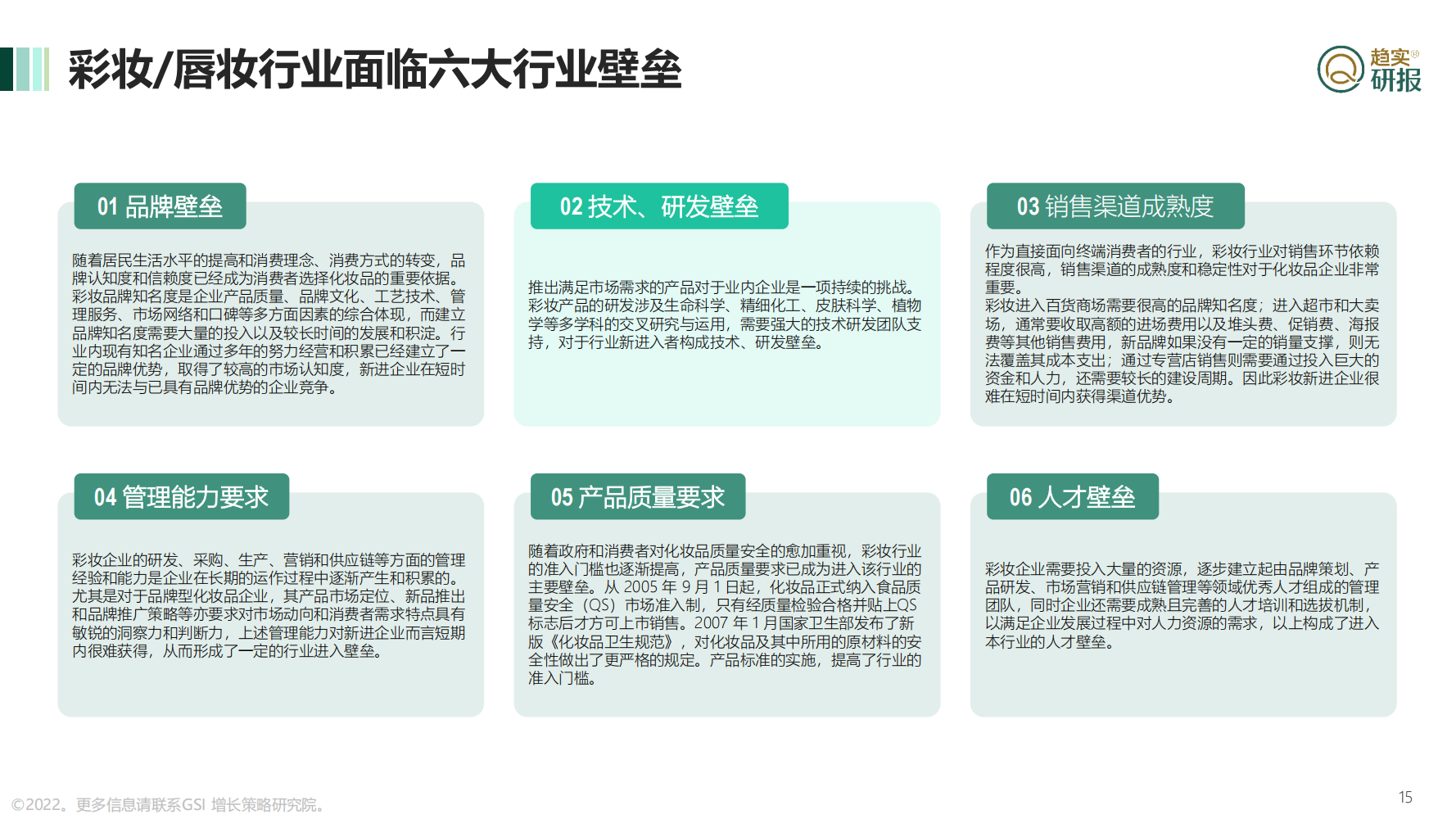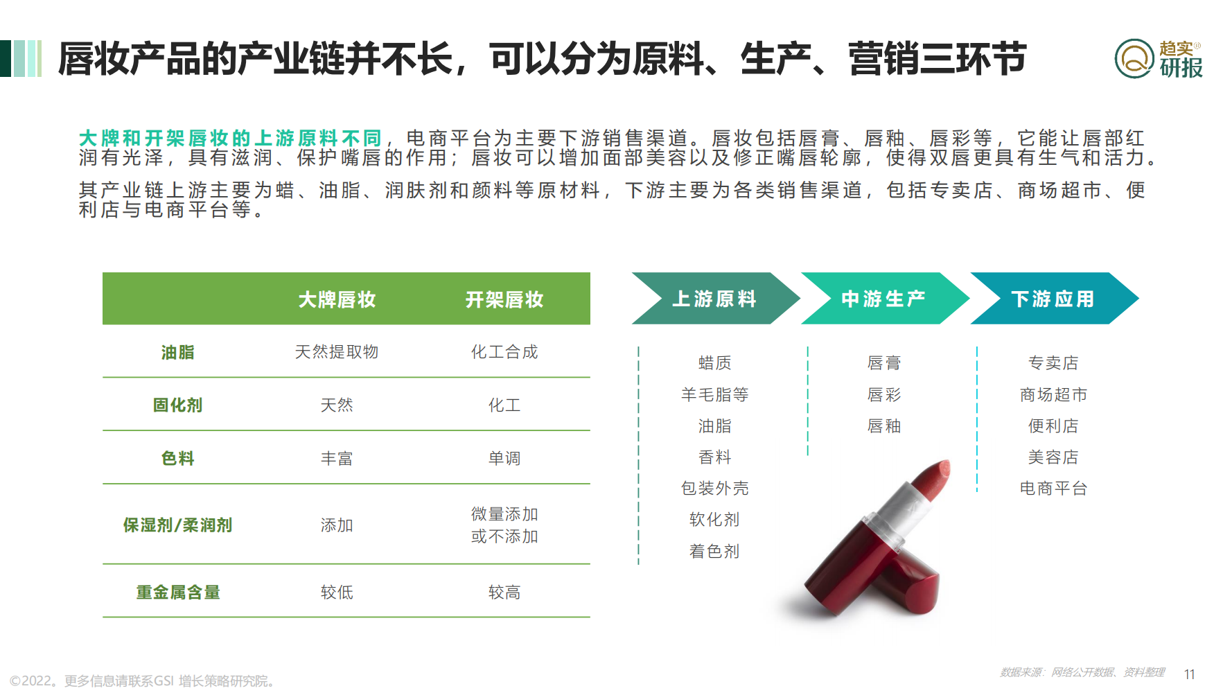近几年,随着彩妆市场规模不断增长,国货彩妆品牌崛起,社交电商兴盛,内容营销兴起,疫情带来的消费需求变化,中国彩妆消费市场也迎来了很大的变化,消费者对于各细分品类的诉求不尽相同。目前彩妆市场规模接近千亿,且高增长确定性较强,但行业随潮流变化快,产品同质化强,品牌在营销端、价格端竞争激烈。整体看近三年国际高端品牌与国货新锐品牌表现突出,未来在疫情结束经济向好的大趋势下,预计新锐国货品牌仍然会是重要增长点。彩妆市场最开始让市场大众消费者接受的就是口红,在生活水平的提高下对于其他彩妆的需求也逐渐增加。在现在颜值经济的时代,自拍和自媒体发展下更加促进了彩妆市场的发展,未来市场会更加多元化。