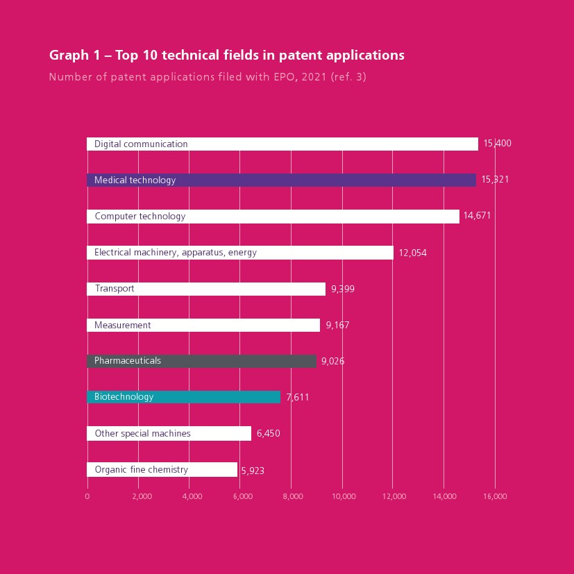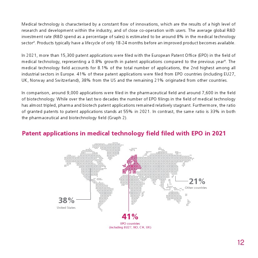 2021 年,欧洲专利局(EPO)在医疗技术行业提交了超过 15300 件专利申请,比上一年增长 0.8%。医疗技术行业占申请总数的8.1%,在欧洲所有工业行业中排名第二。这些专利申请中有41% 来自欧洲专利局国家(包括欧盟 27 国、英国、挪威和瑞士),38%来自美国,其余 21% 来自其他国家。