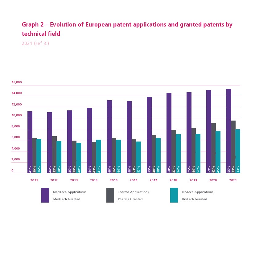 相比之下,制药行业提交了约 9000 份申请,生物技术行业提交了约7600份申请。虽然在过去20年中,医疗技术行业的 EPO 申请数量几乎增长了两倍,但制药和生物技术专利申请仍然相对停滞不前。此外,2021年专利授权与专利申请的比例为 55%。相比之下,制药和生物技术行业的这一比例均为33%。