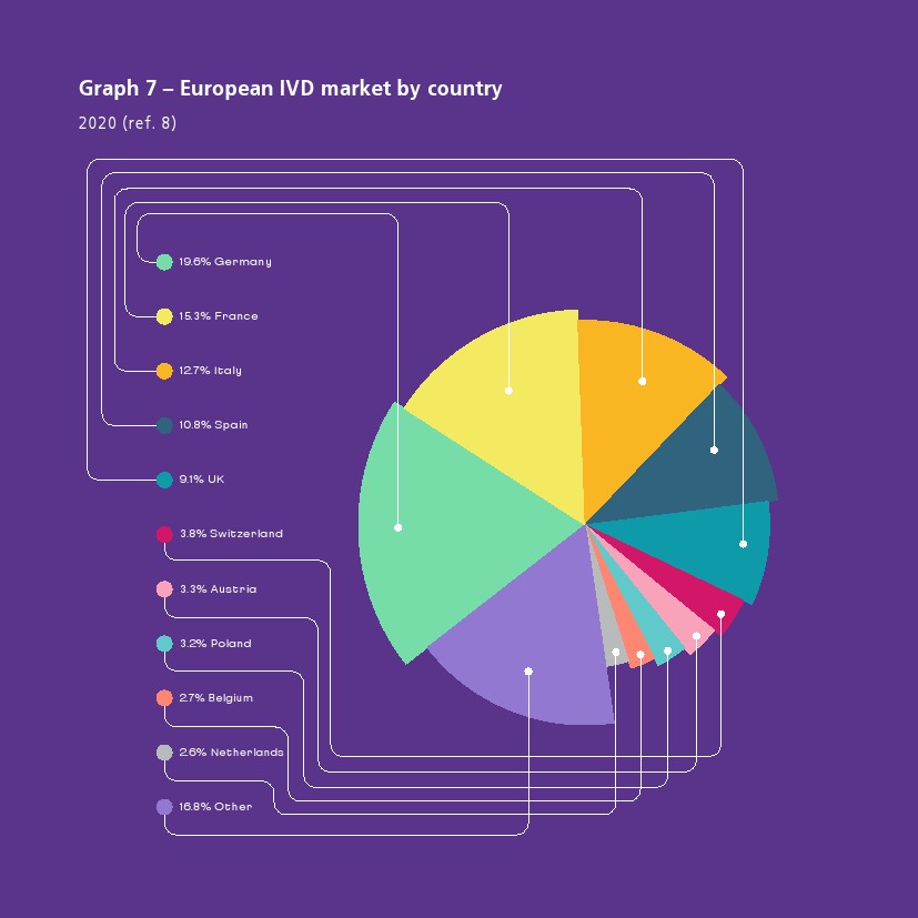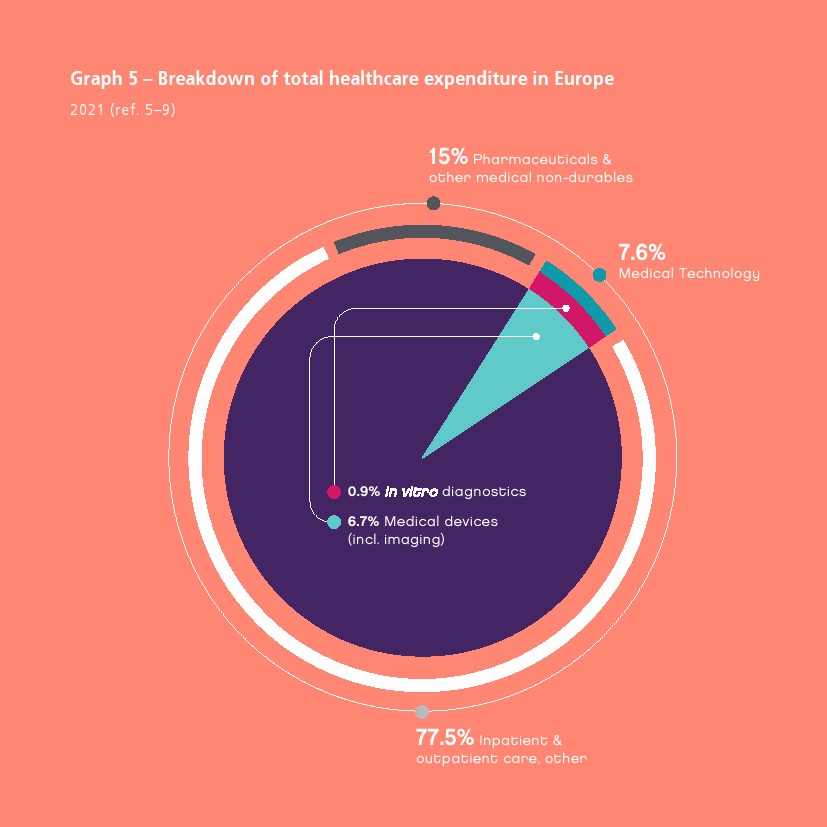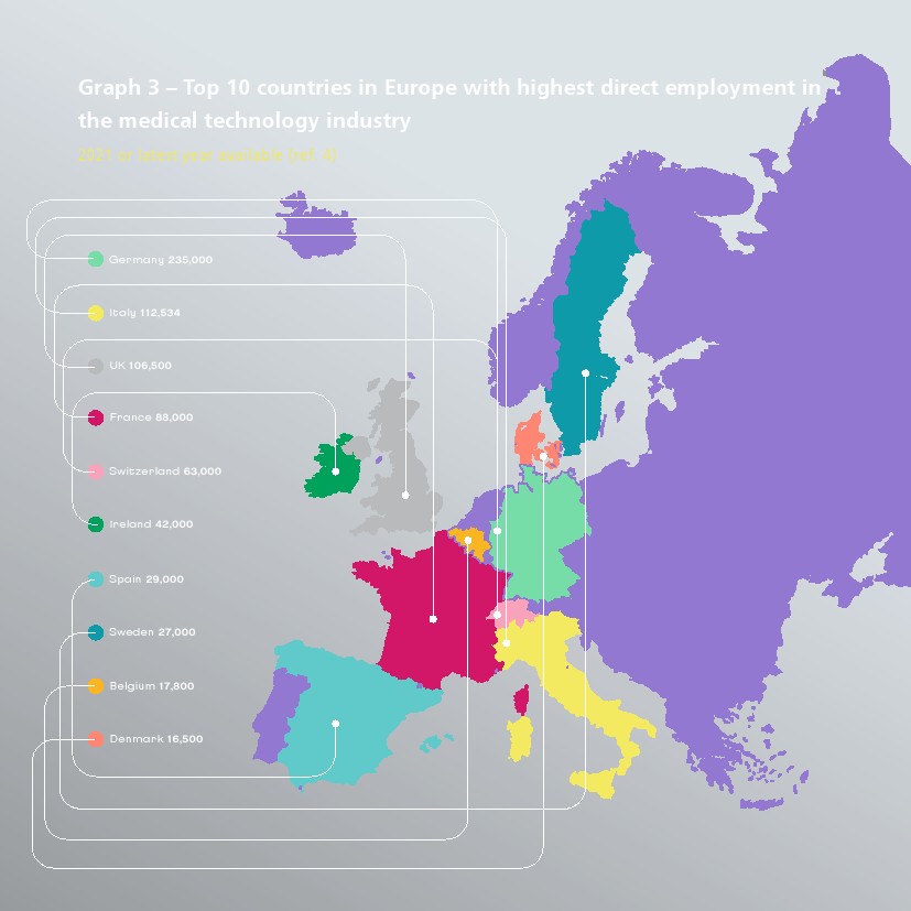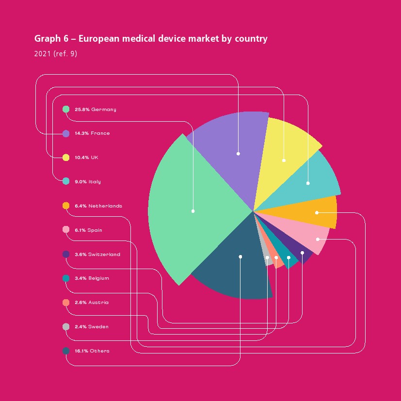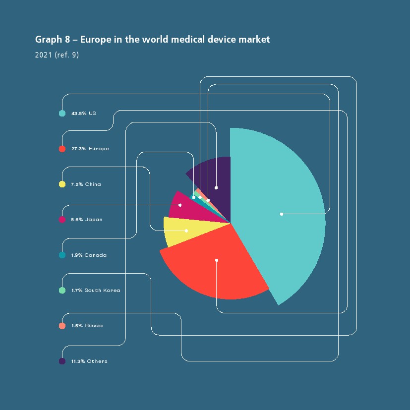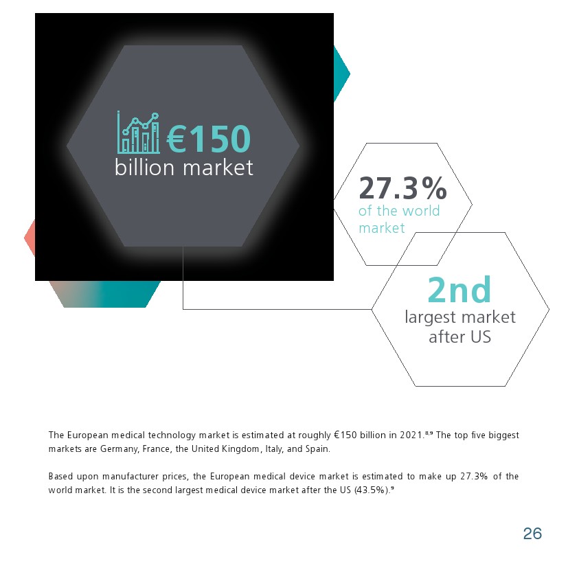 2021年8月欧洲医疗技术市场估计约为 1500 亿欧元,前5个最大市场是德国、法国、英国、意大利和西班牙。欧洲医疗器械市场估计占世界市场的27.3%,是仅次于美国(43.5%)的第二大医疗器械市场。