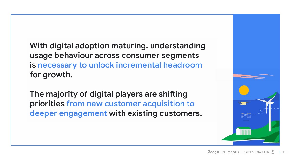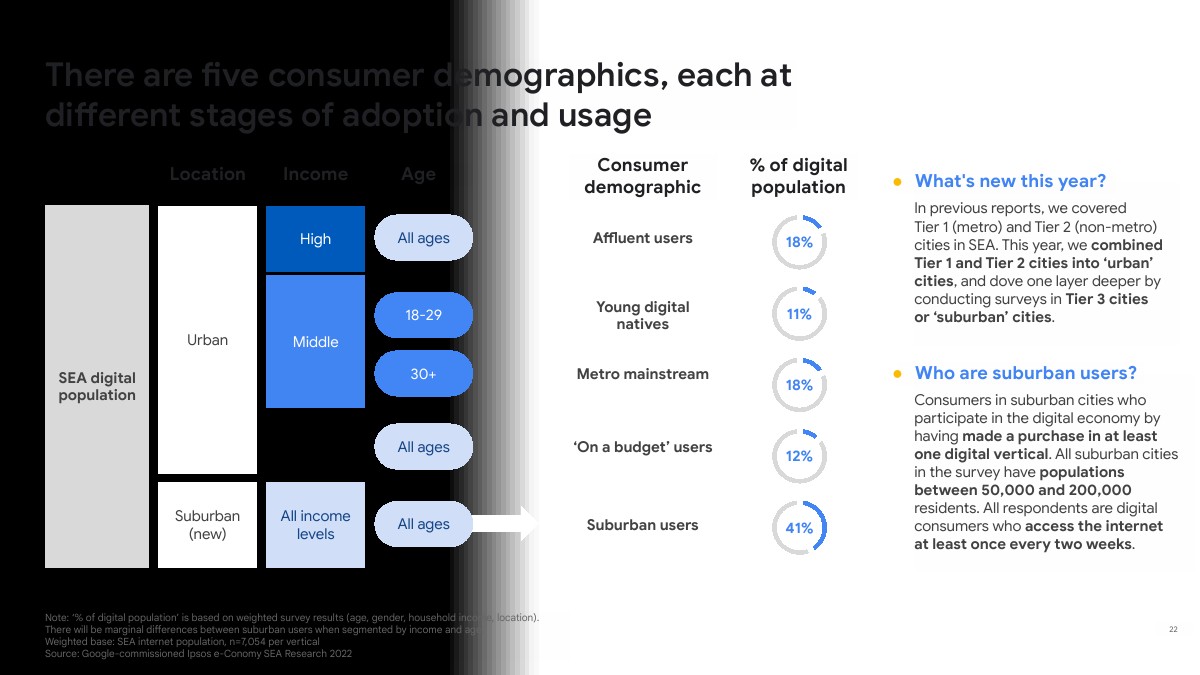在城市地区,富裕的消费者和他们年轻的数字原住民继续代表着数字经济的最大部分。对于这两个细分市场,增长机会在于更深入的参与,包括更频繁和更有价值的订单、订阅或消费者贷款等交叉销售服务。与此同时,“预算有限”的城市消费者和郊区消费者的支出仍然较低,这让数字玩家需要找到更经济可持续的方式来为享受服务。