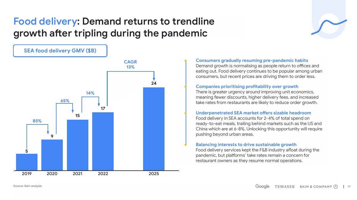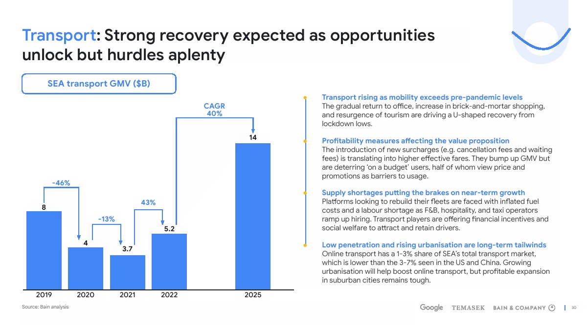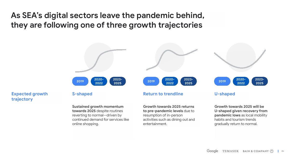 SEA 的数字经济行业遵循三个截然不同的趋势线。电子商务遵循 S 形增长曲线,继续保持增长轨迹,但在大流行期间急剧加速之后,起点更高。在经历了两年的飙升之后,送餐和在线媒体等其他业务正在回归趋势线。最后,旅行和运输正在沿着 U 形复苏,距离大流行前的水平还有几英里远。