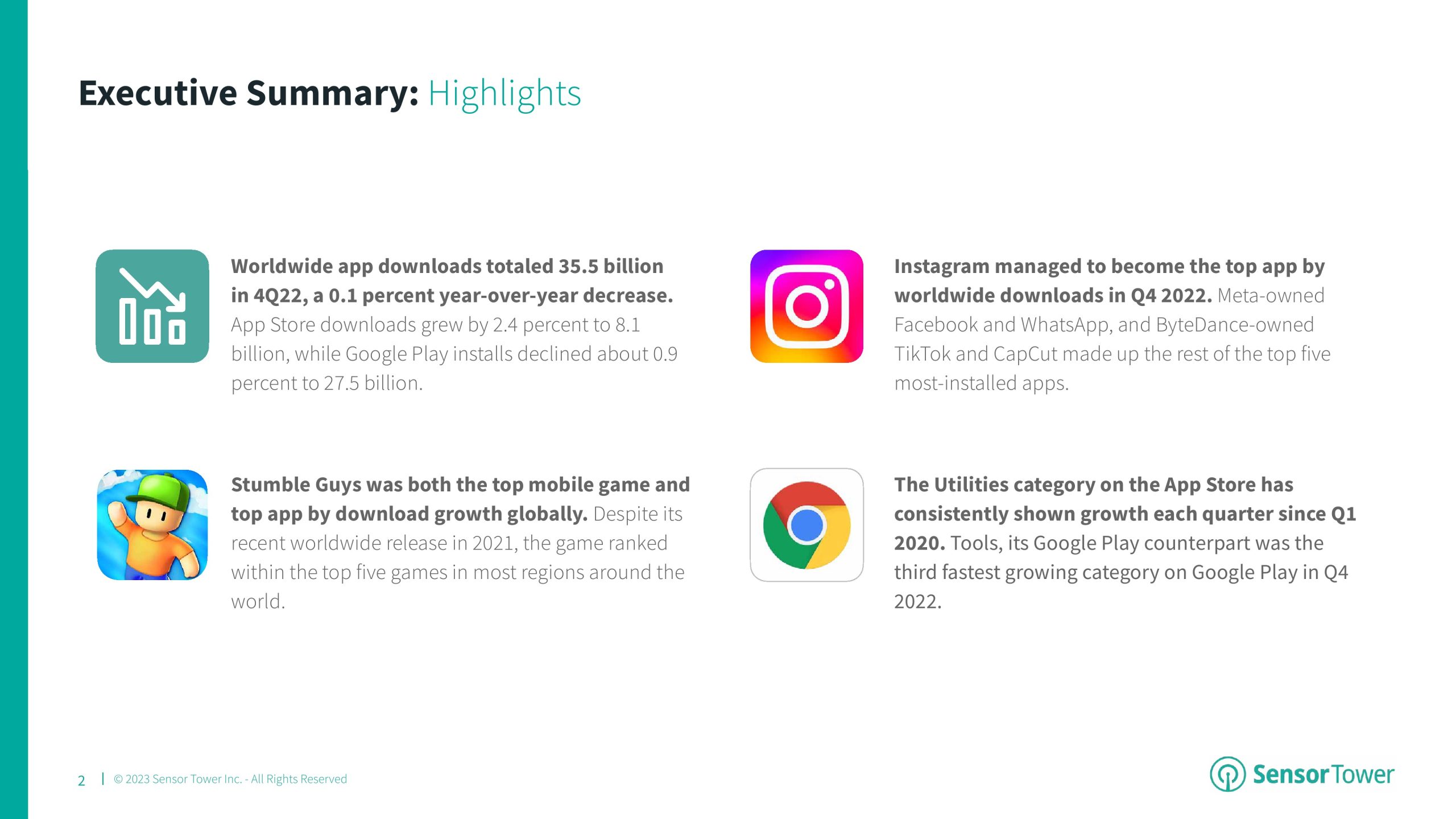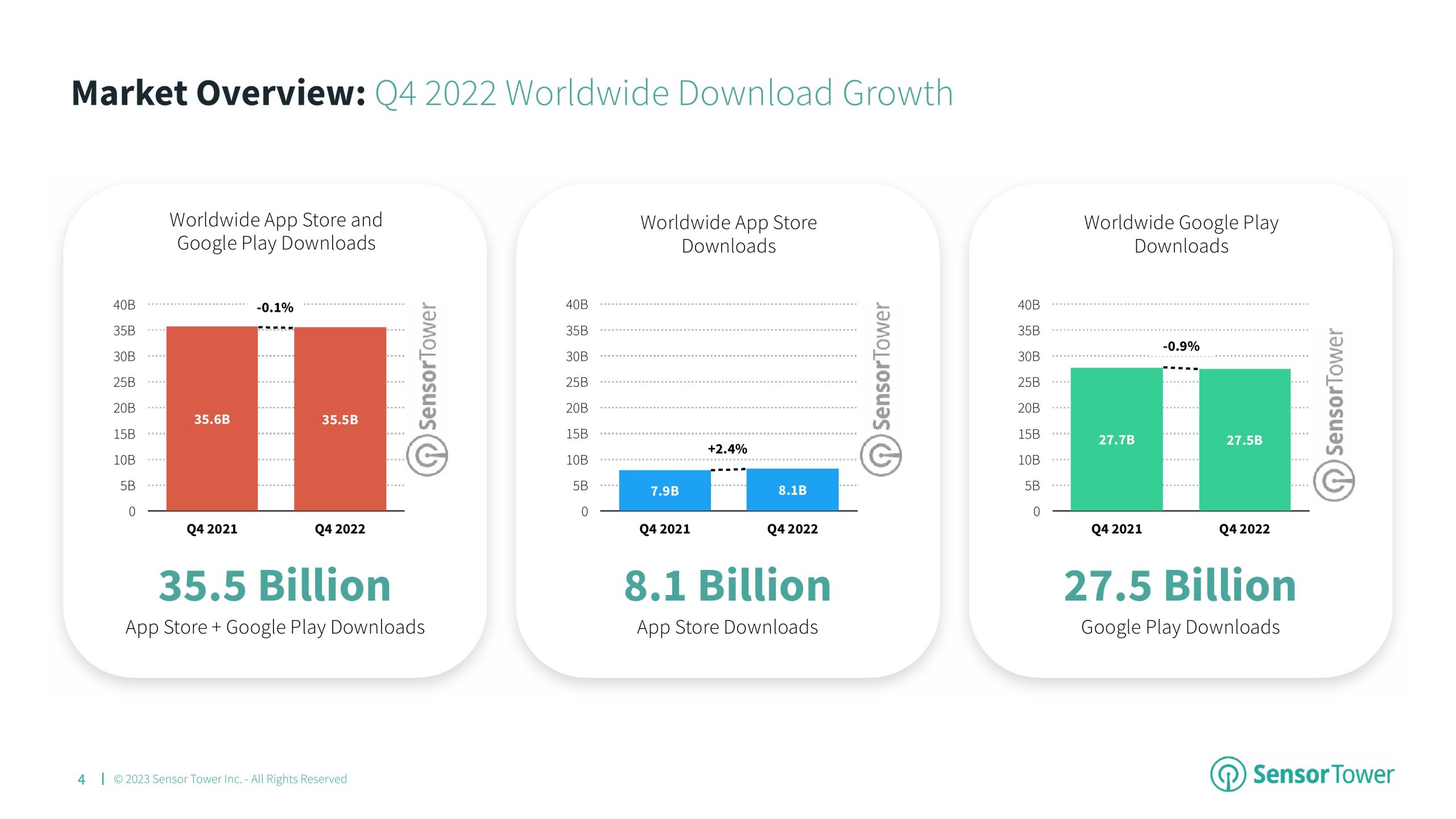 Sensor Tower发布了“2022 年第四季度应用报告”,移动应用程序的采用已经趋于平稳,App Store 和 Google Play的全球应用程序下载量同比下降 0.1%,到 2022 年第四季度达到 355 亿次。