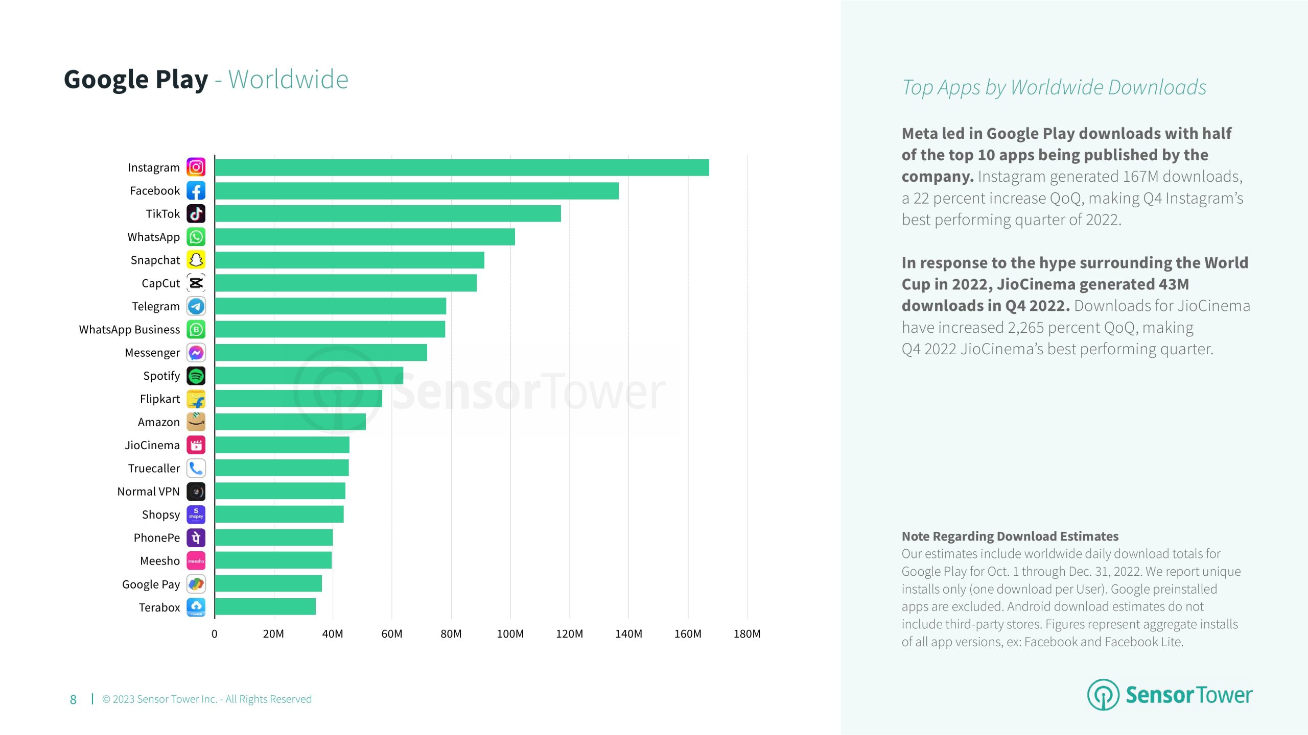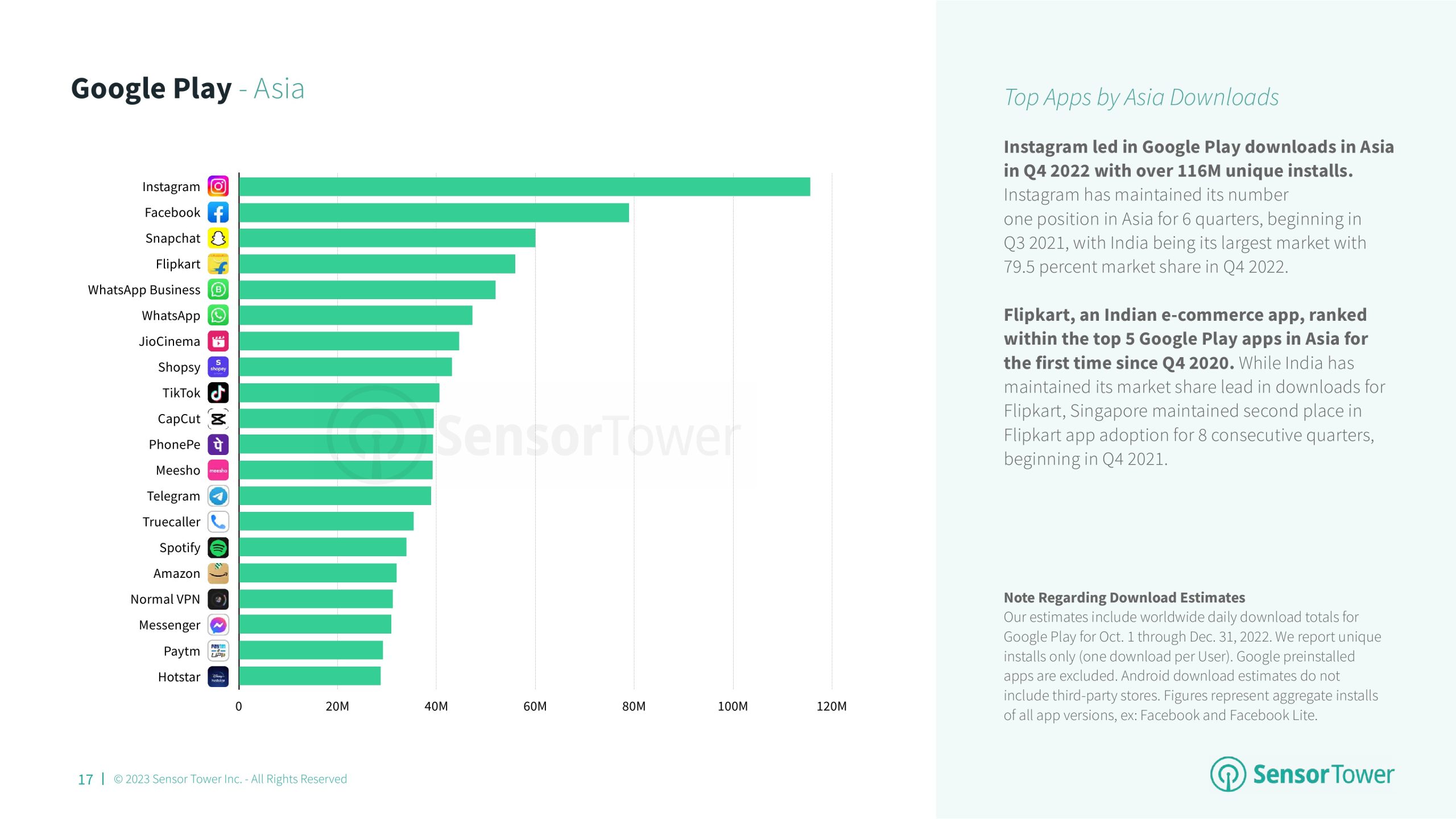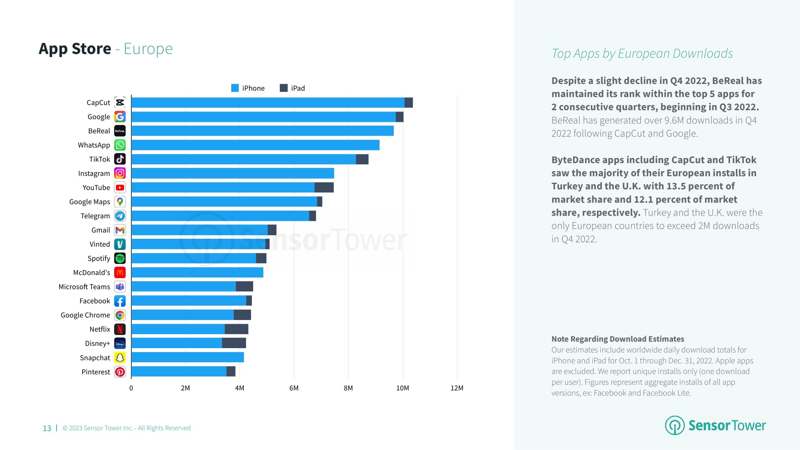 社交媒体应用程序仍然竞争激烈。自 2021 年第二季度以来,Instagram 在过去7个季度中一直占据前三名的位置,并在 2022 年第四季度保持其全球第一应用程序的排名。TikTok 和 Facebook 分别位居全球第二和第三。