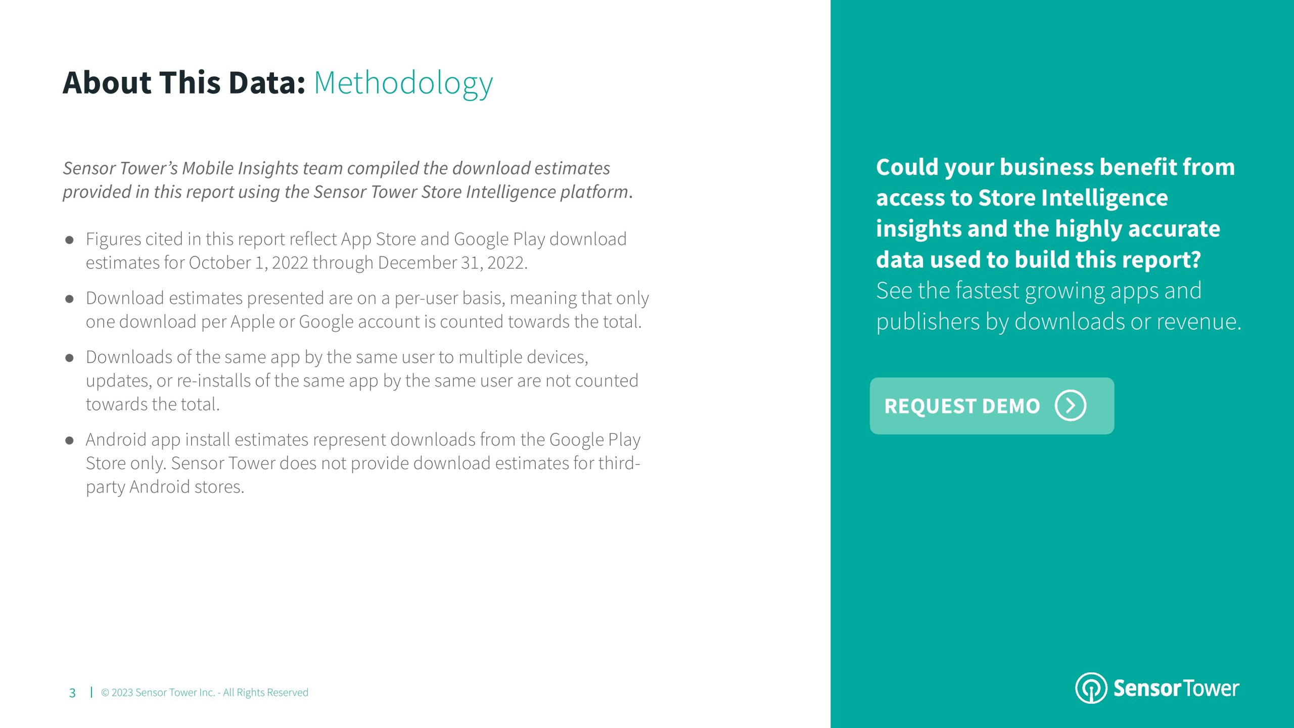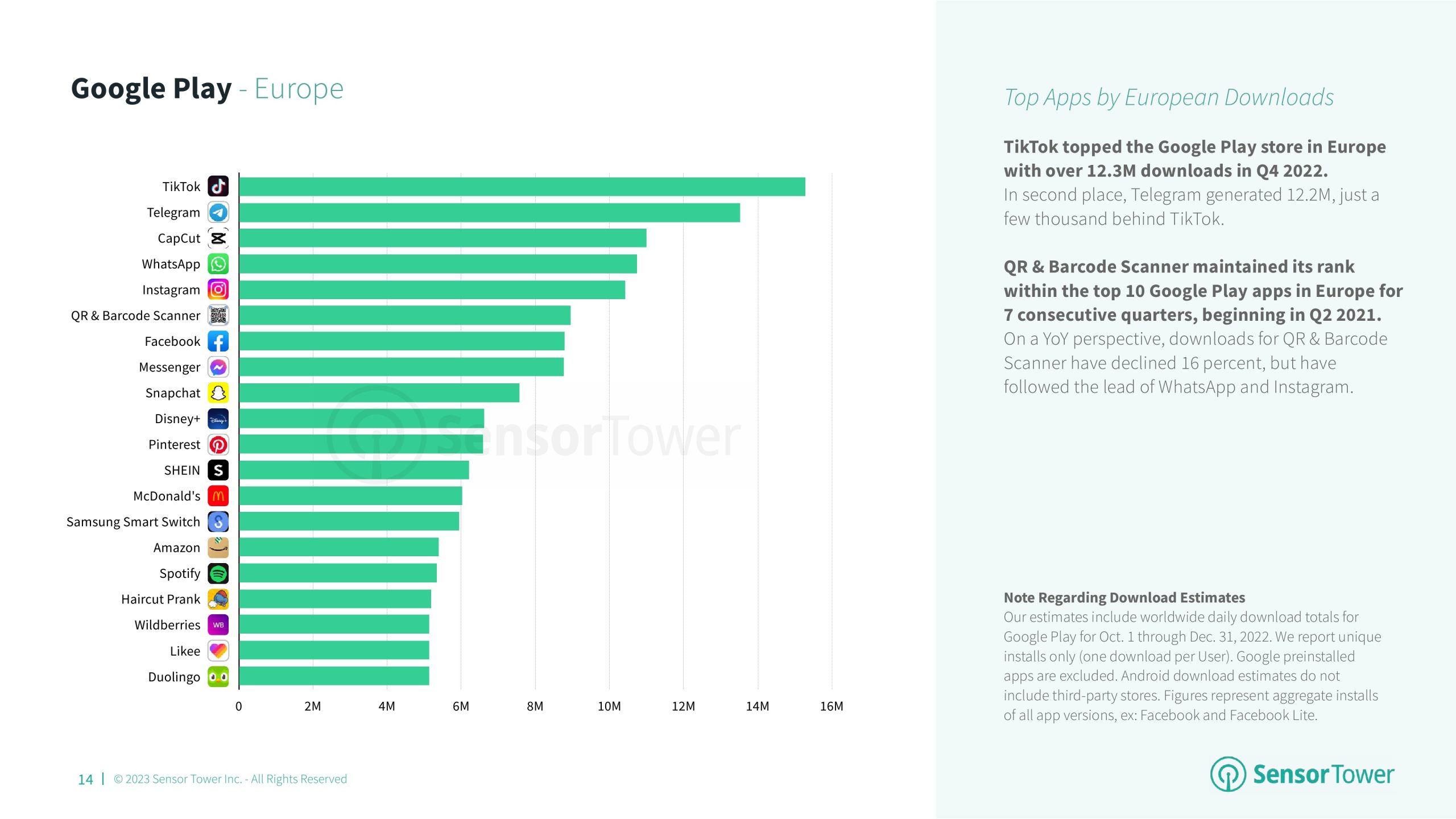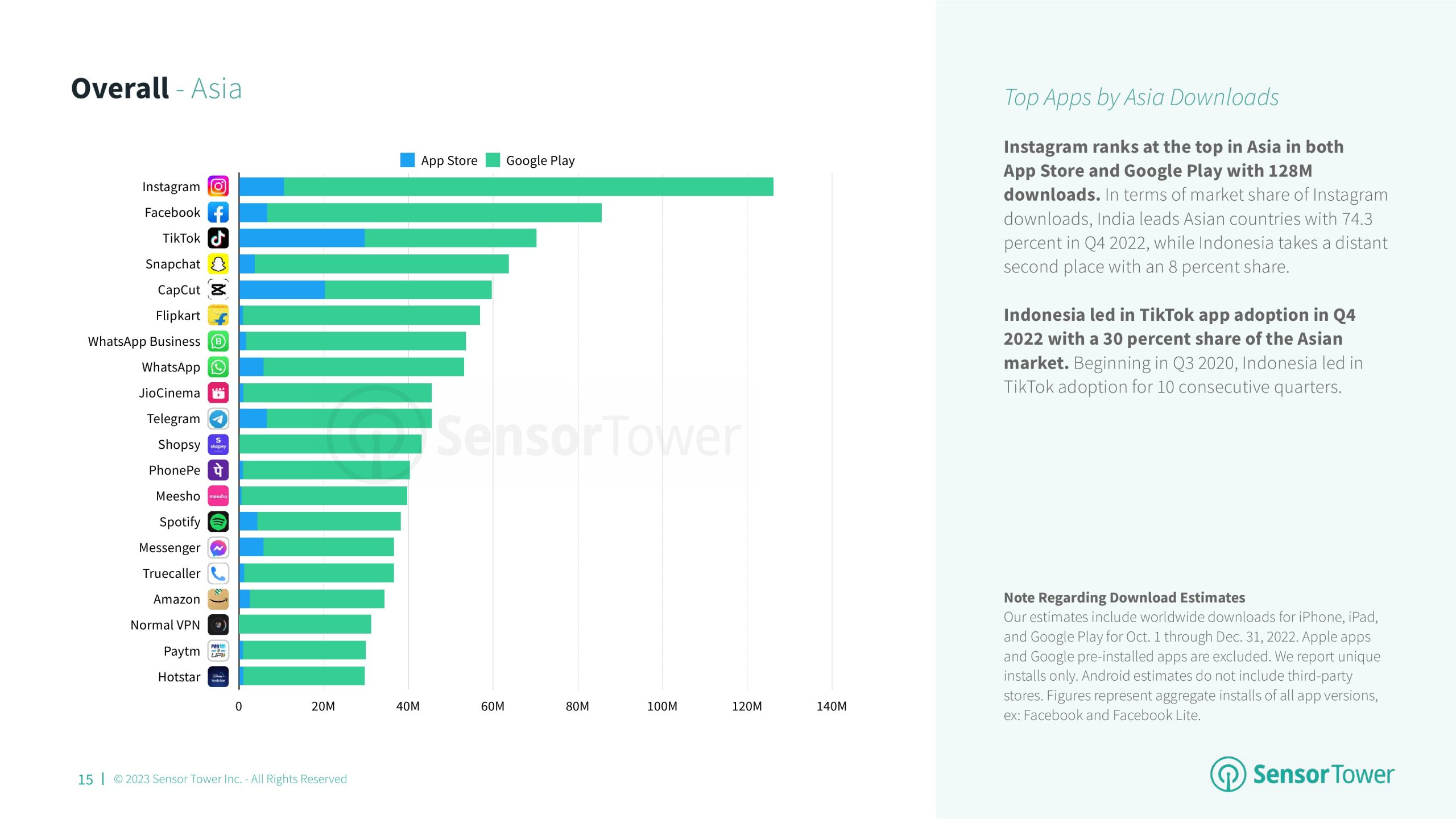 社交媒体应用程序仍然竞争激烈。自 2021 年第二季度以来,Instagram 在过去7个季度中一直占据前三名的位置,并在 2022 年第四季度保持其全球第一应用程序的排名。TikTok 和 Facebook 分别位居全球第二和第三。