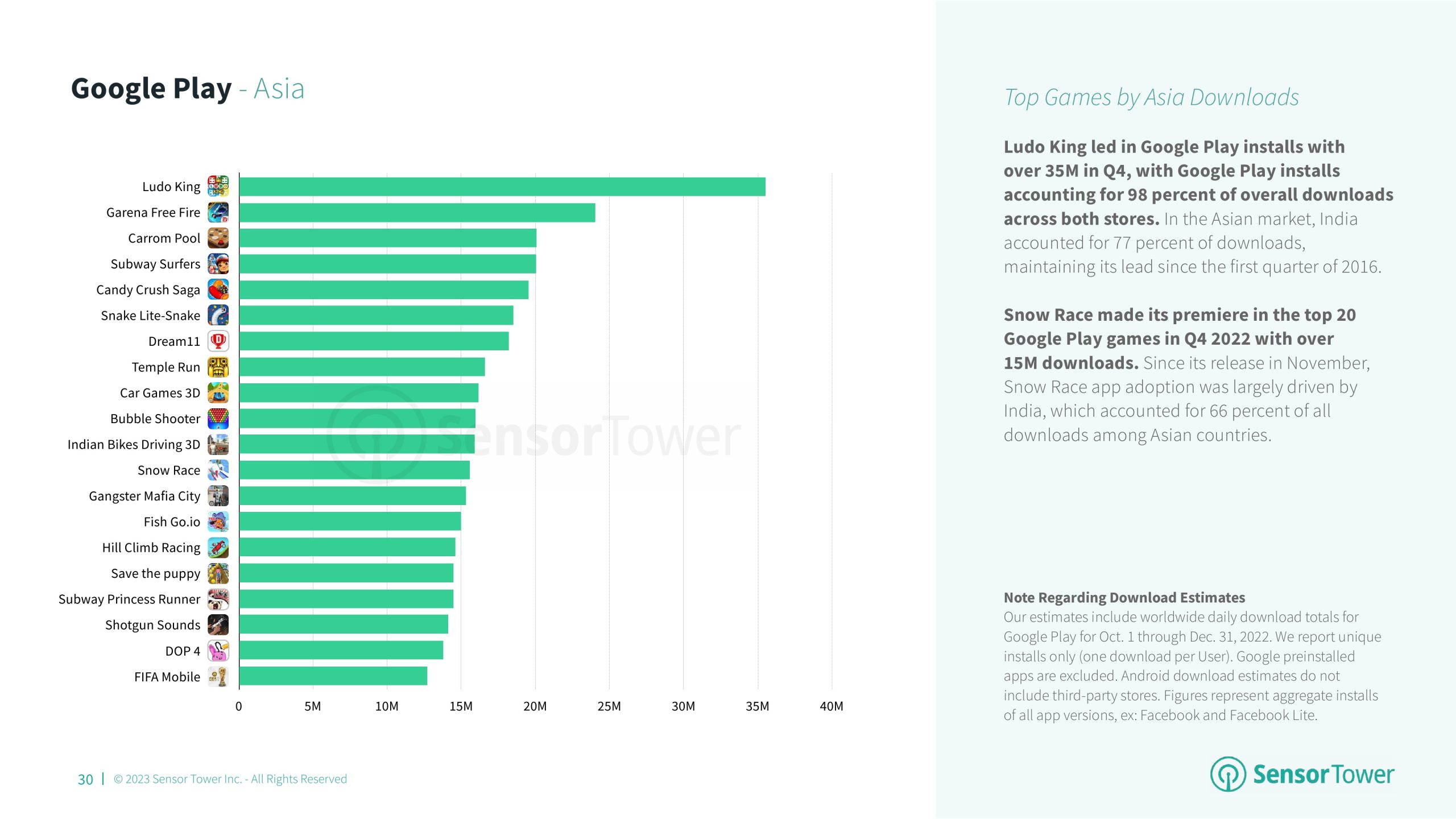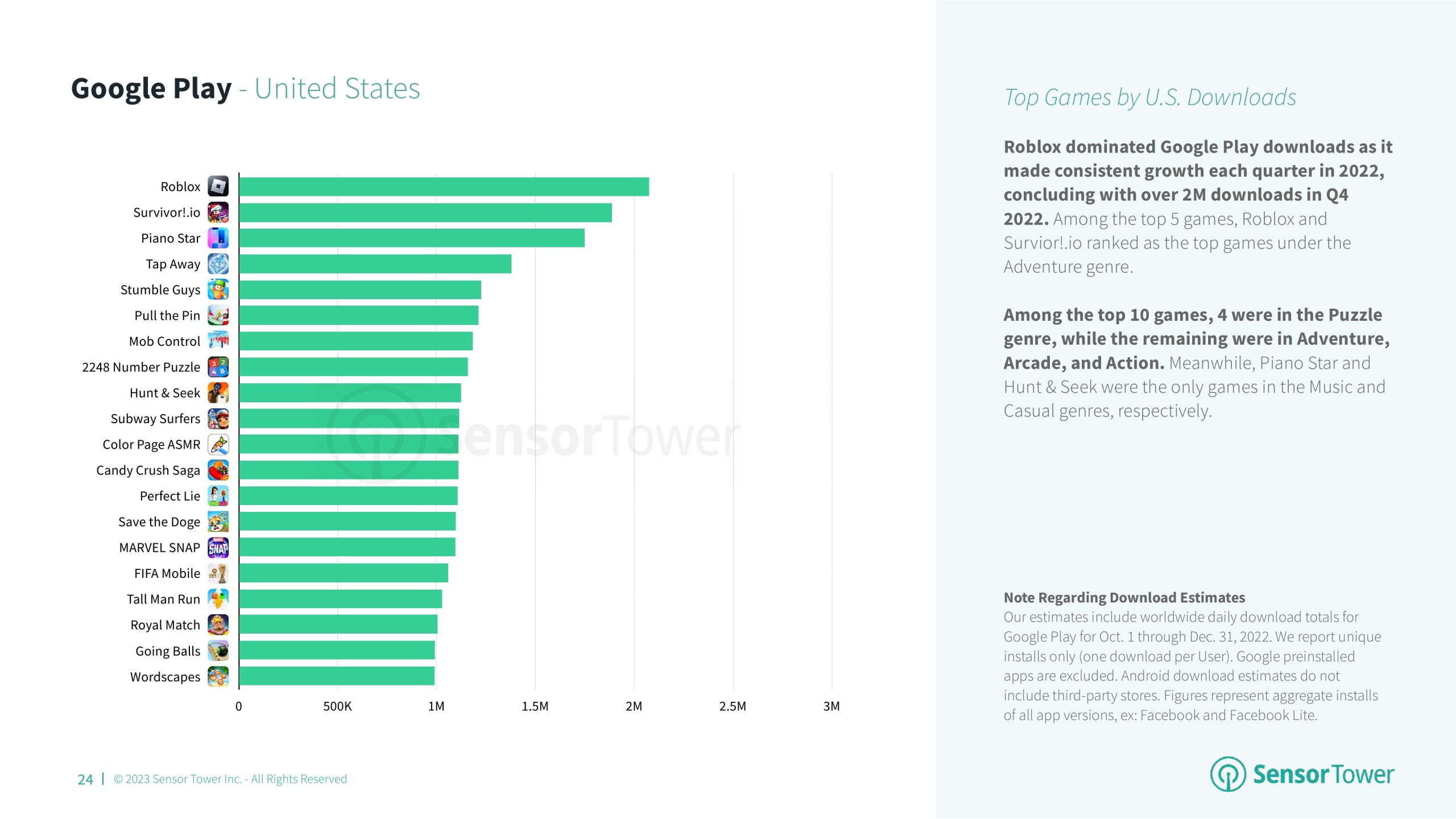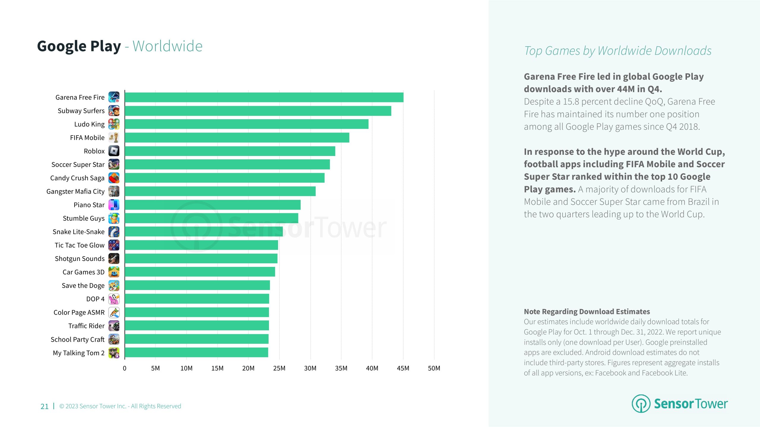 虽然顶级手机游戏的全球下载量环比下降,但世界杯等赛事推动了足球游戏的下载量。《FIFA Mobile》和《Soccer Super Star》在 2022 年第四季度分别环比增长137%和112%。