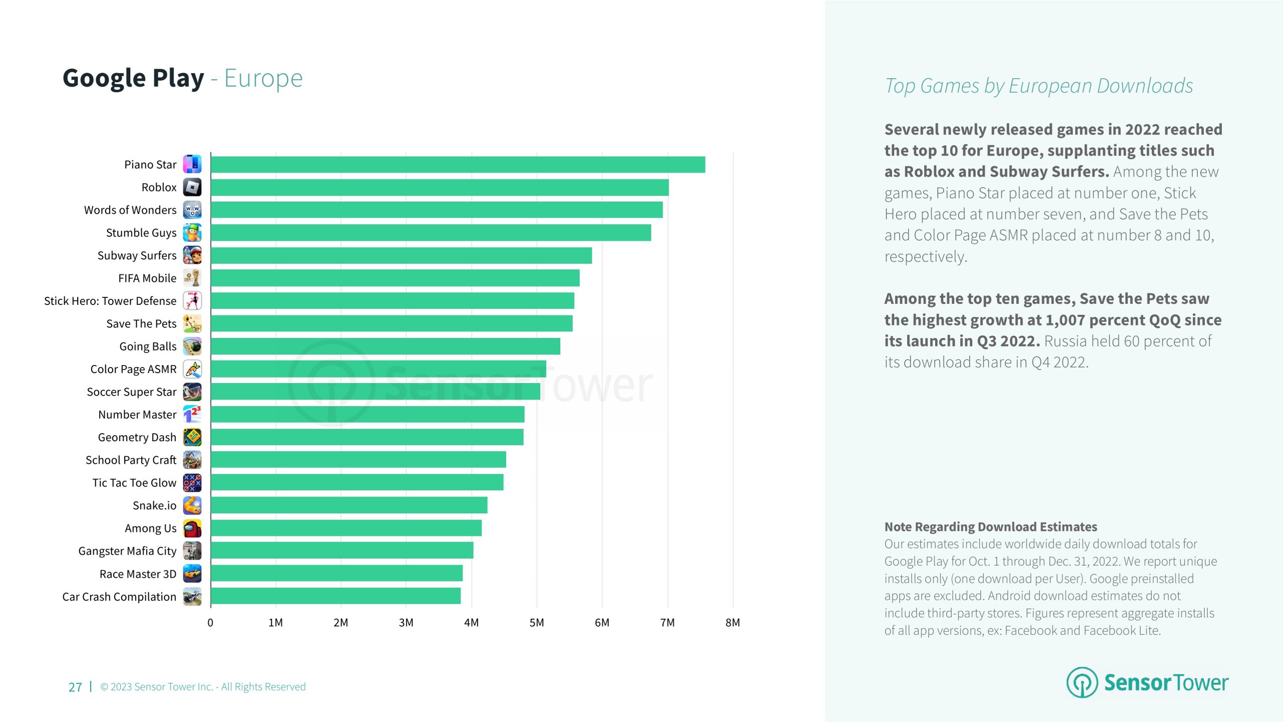 Kitka Games 的《Stumble Guys》是一款出色的移动应用程序,主导了 2022 年的下载量增长。这款游戏是 2022 年下载量增长最快的应用程序。在拉丁美洲和欧洲排名第一,2022年在这些地区的下载量分别超过 5000 万次和 3600 万次。