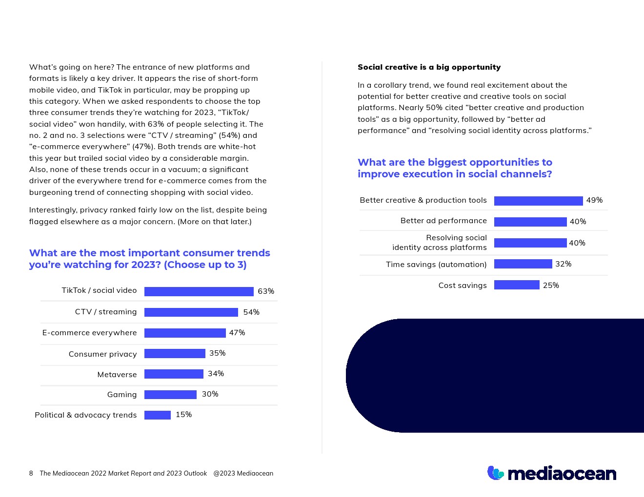 引领潮流的是 TikTok,或者更广泛地说,是社交视频。面对 7 种消费趋势并要求最多列举 3 种他们认为在 2023 年最值得观看的趋势,63% 的受访者选择了广受欢迎的 TikTok / 社交视频。