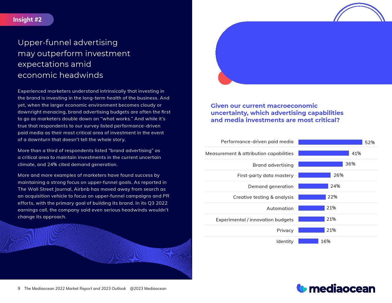 Mediaocean调查发现,随着营销人员因经济不景气调整业绩和品牌预算分配,业绩驱动的付费媒体(52%)是宏观经济不确定性下最关键的广告能力和媒体投资。 即便如此,仍有相当一部分人(36%)认为品牌广告在这个时代至关重要。