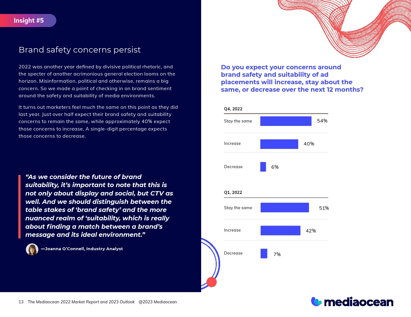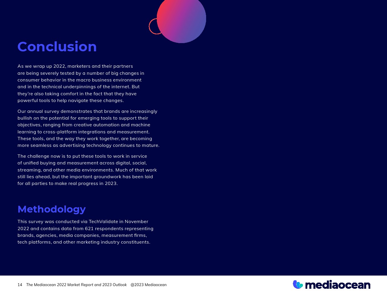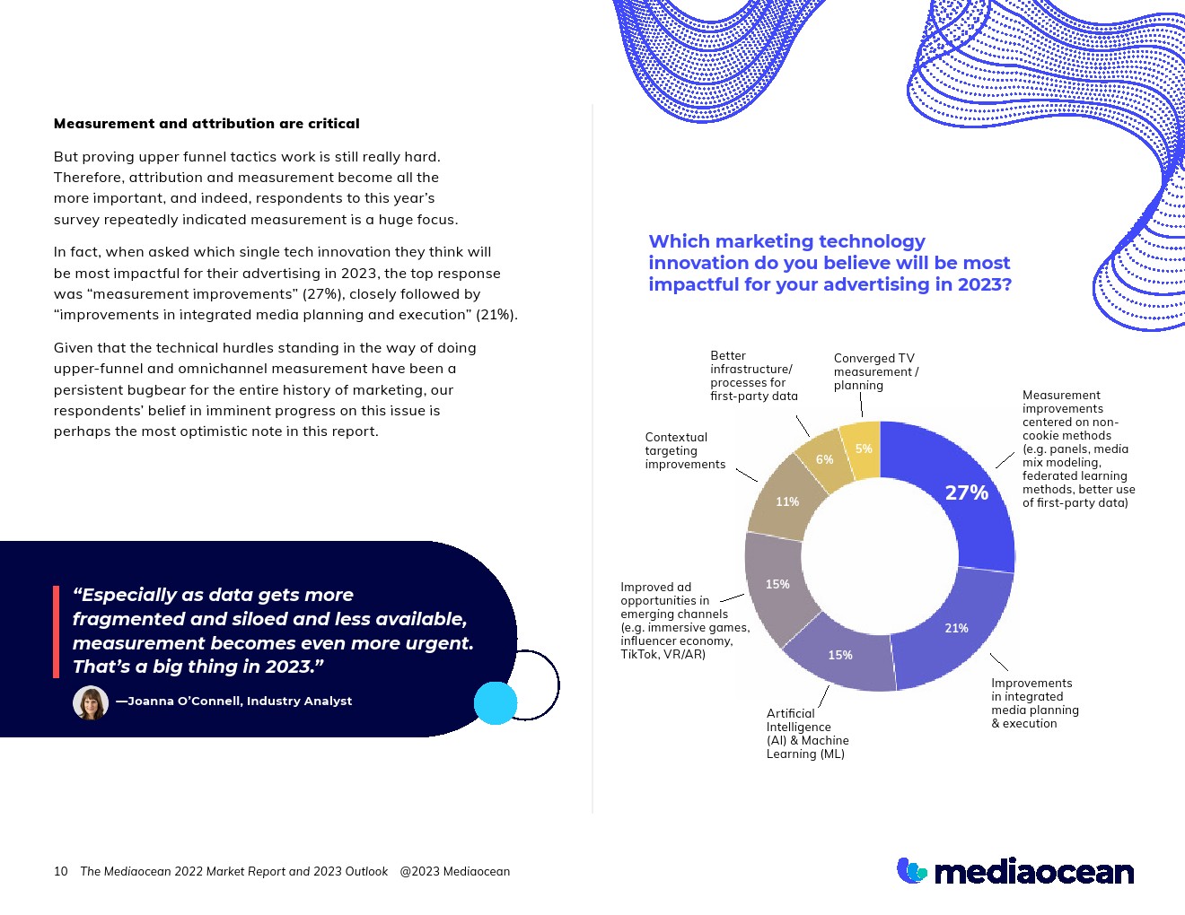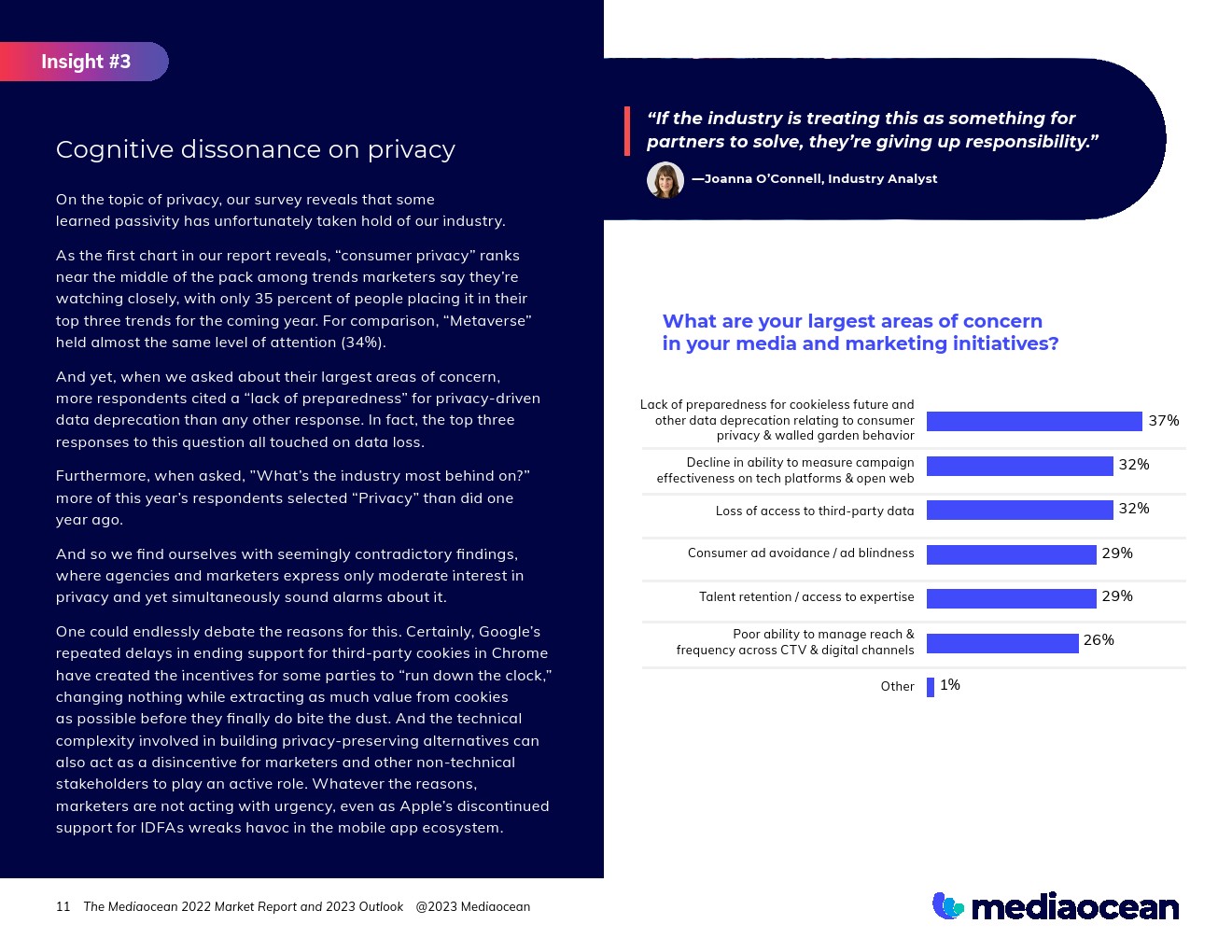 另外,受访者在媒体和营销计划中最大的担忧是缺乏对无 cookie 未来的准备,以及与消费者隐私和围墙花园行为相关的其他数据弃用。 因此,最大比例(27%)的受访者认为今年对其广告影响最大的营销技术创新是非 cookie 方法,例如面板、媒体组合建模、联合学习方法、更好的使用第一方数据。下一个最具影响力的营销技术创新预计将是整合媒体规划和执行的改进(21%),这一点在去年位居榜首。