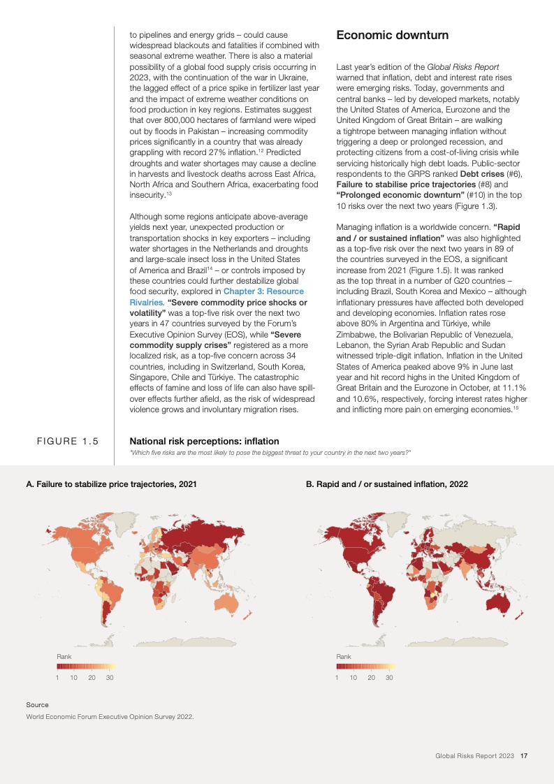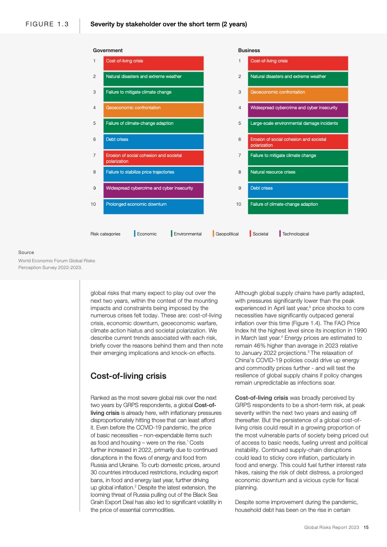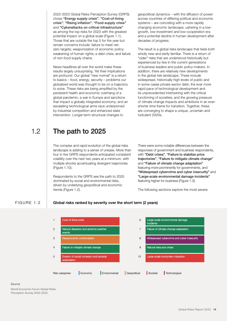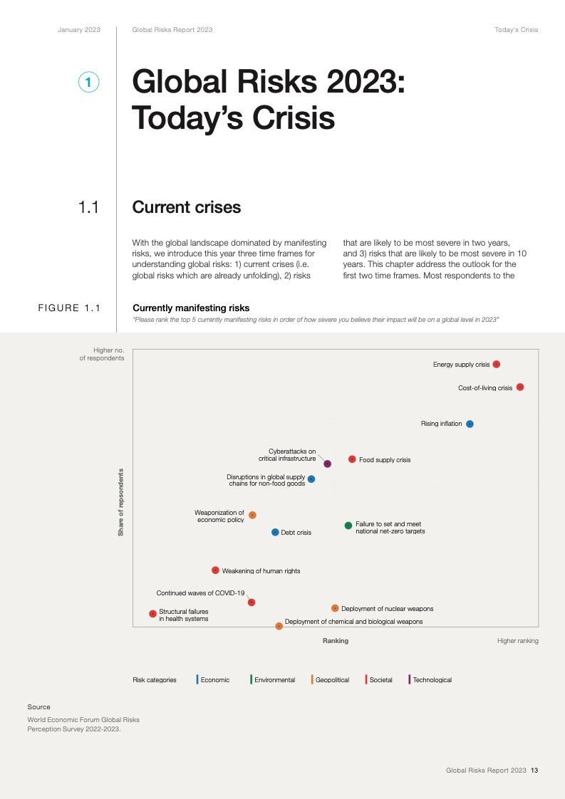 当前,在全球新冠疫情和欧洲战争的影响下,能源、通货膨胀、粮食和安全危机重新成为焦点。在这些危机的推动下,下列后续风险将主导未来两年的风险格局:经济衰退风险、日益严重的债务困境、持续发酵的生活成本危机、错误信息和虚假信息导致的社会极化趋势、快速气候行动的中断以及零和博弈的地缘经济战争。