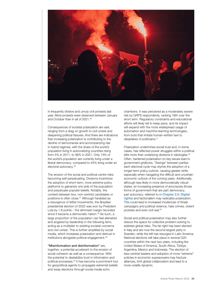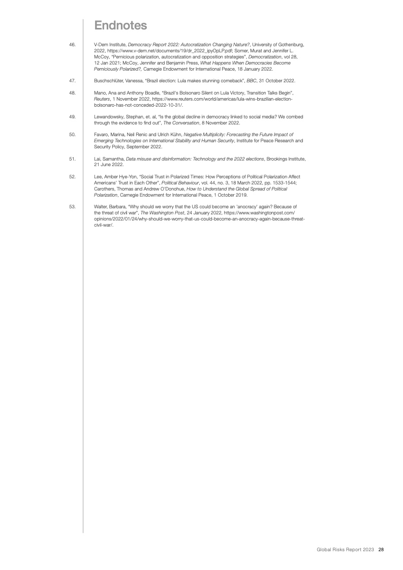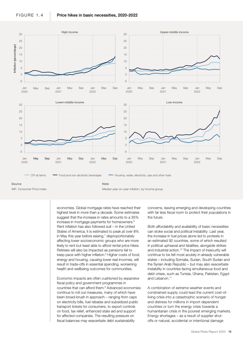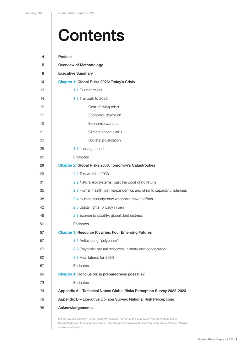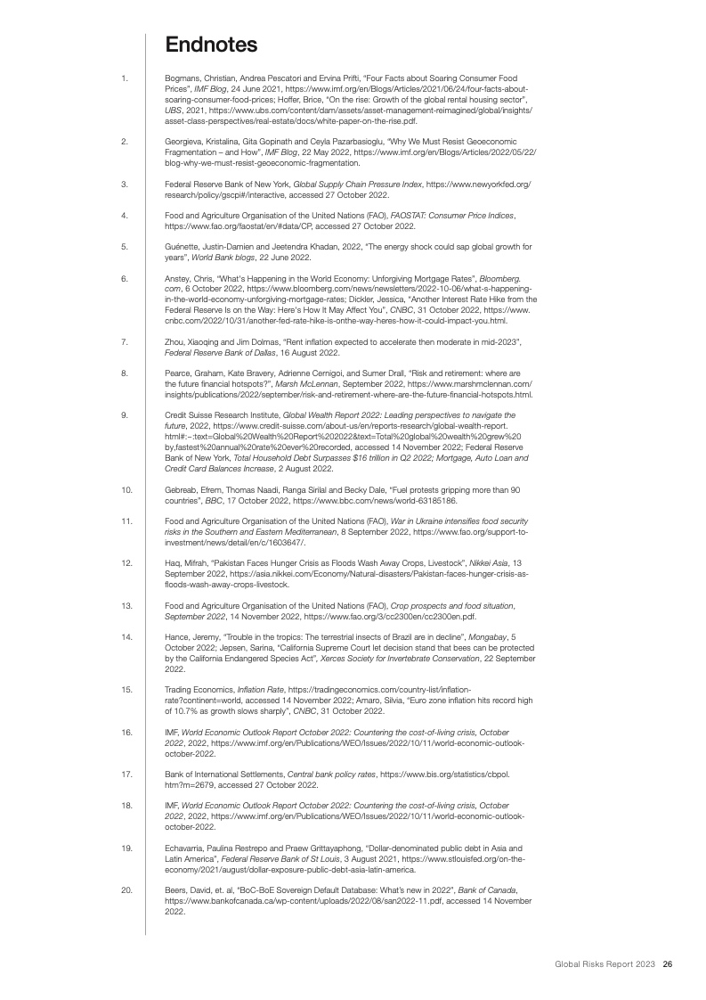 当前,在全球新冠疫情和欧洲战争的影响下,能源、通货膨胀、粮食和安全危机重新成为焦点。在这些危机的推动下,下列后续风险将主导未来两年的风险格局:经济衰退风险、日益严重的债务困境、持续发酵的生活成本危机、错误信息和虚假信息导致的社会极化趋势、快速气候行动的中断以及零和博弈的地缘经济战争。