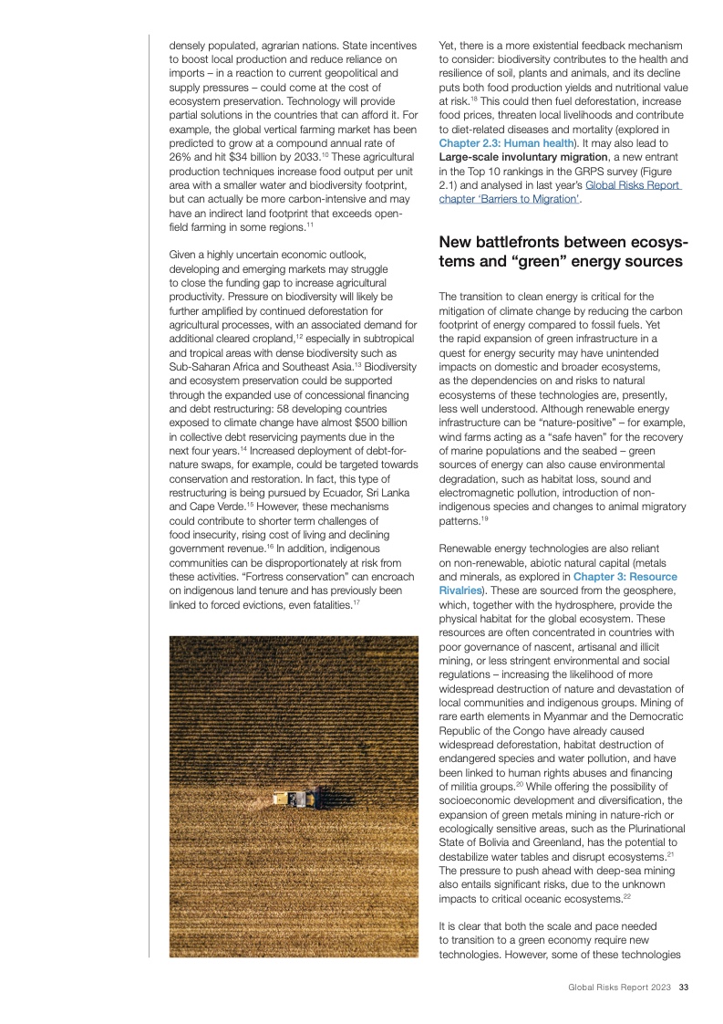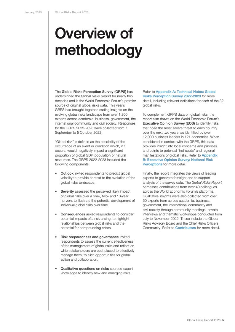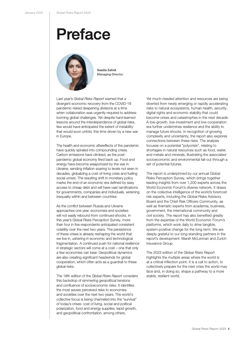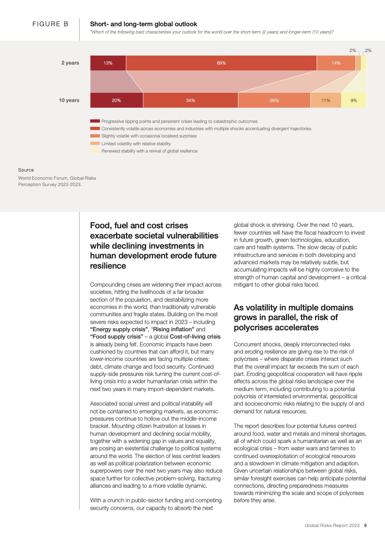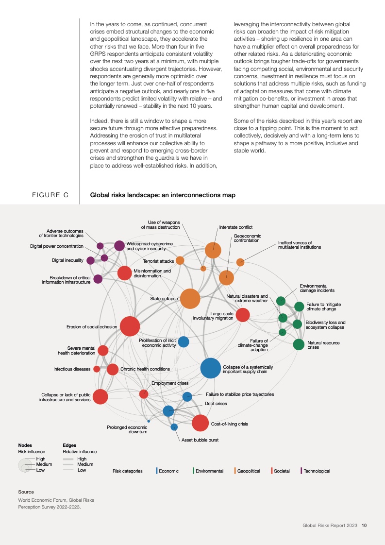 过去17年中,世界经济论坛《全球风险报告》一直警示深度互联的各项全球风险。《2023年全球风险报告》显示,冲突和地缘经济矛盾已经引发了一系列深度互联的全球风险,包括可能会在未来两年持续困扰世界的能源和粮食供应不足的问题,以及生活成本和偿债成本急剧上升的问题。与此同时,这些危机会破坏国际社会为了解决长期风险而开展的各项行动,尤其是和气候变化、生物多样性以及人力资本投资相关的风险。