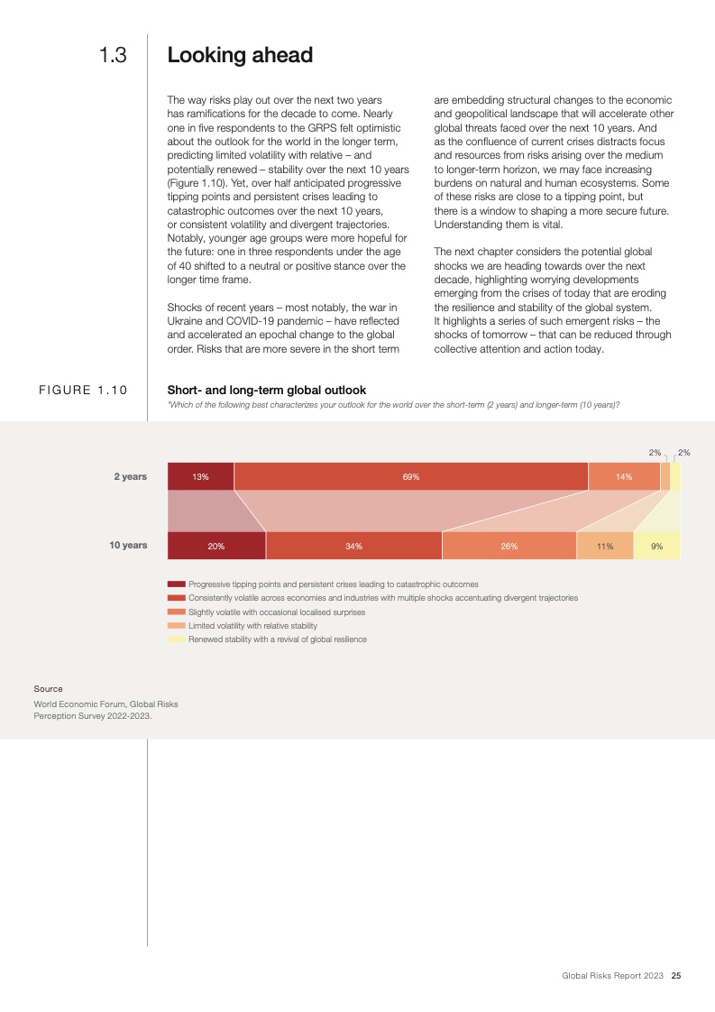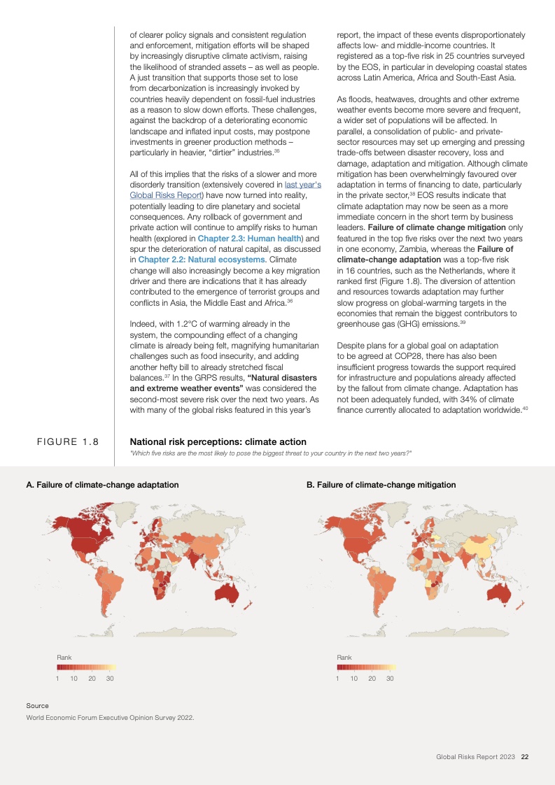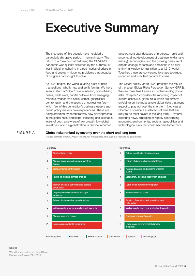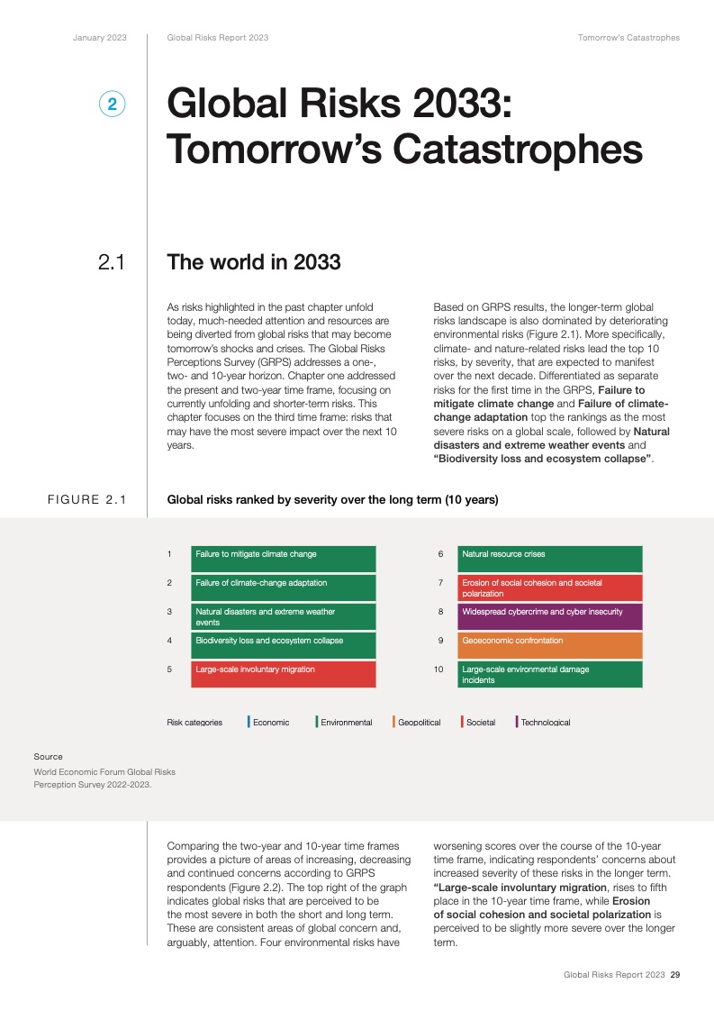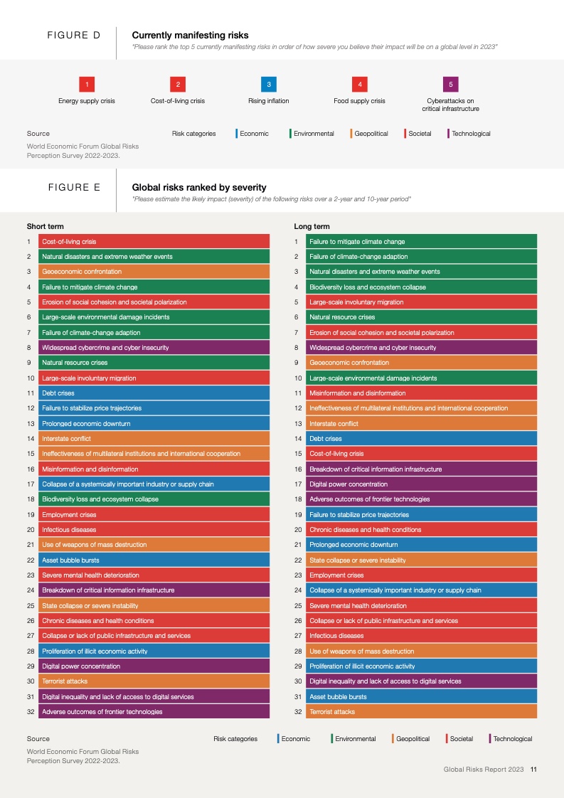 上述结论源自今日发布的《2023年全球风险报告》。报告指出,针对最严重的长期威胁的行动窗口正在快速关闭,因此在各项风险到达临界点之前,国际社会需要开展集体行动。