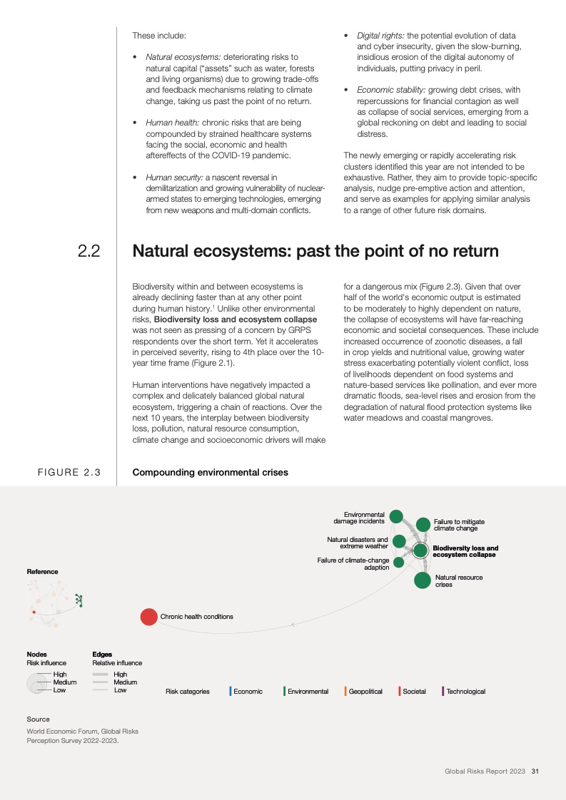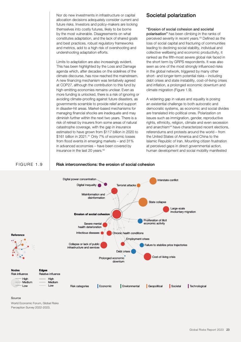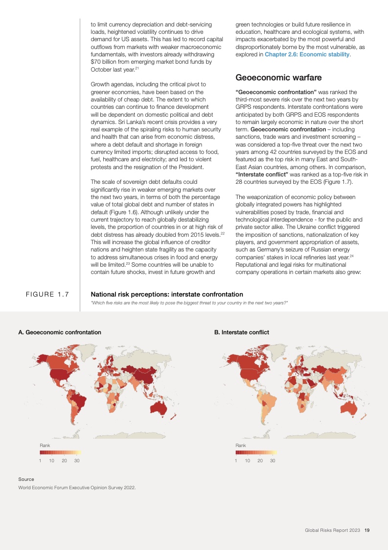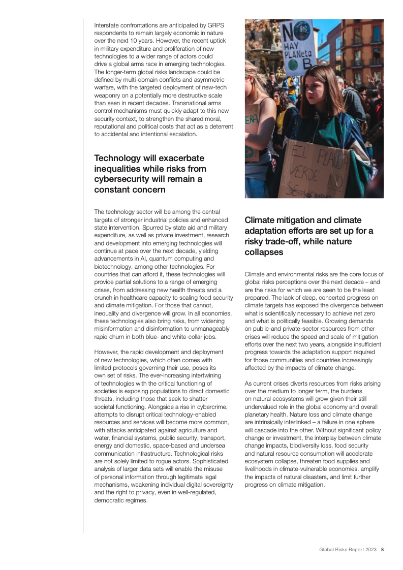如果国际社会不能在气候减缓和气候适应领域进行更加有效的合作,那么上述风险将在未来十年导致持续的全球变暖和生态崩溃。减缓和适应气候变化的行动失败、自然灾害、生物多样性丧失和环境恶化这五项风险入选全球十大风险,而生物多样性丧失被视为未来十年快速恶化的全球性风险之一。与此同时,危机引发的领导权竞争和地缘政治对抗会导致前所未有的社会困境,再加上卫生、教育和经济发展领域的投资逐渐消失,这些都会让社会凝聚力进一步遭受削弱。最后,不断加剧的对抗还会导致地缘经济日益武器化和重新军事化,特别是在新技术和流氓行为主体的推动作用下。