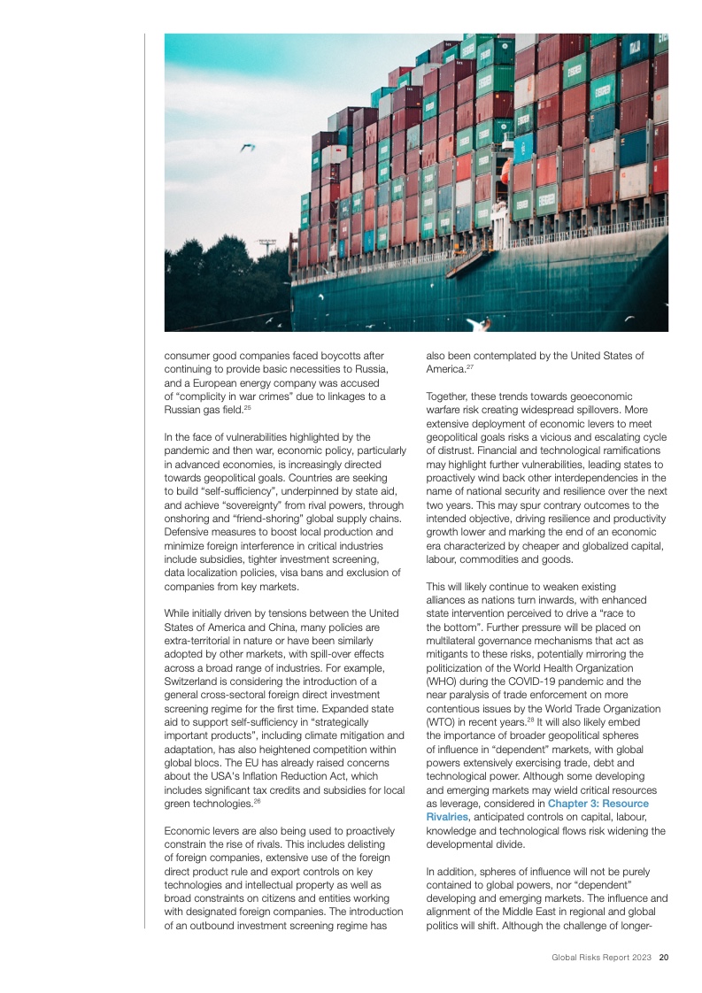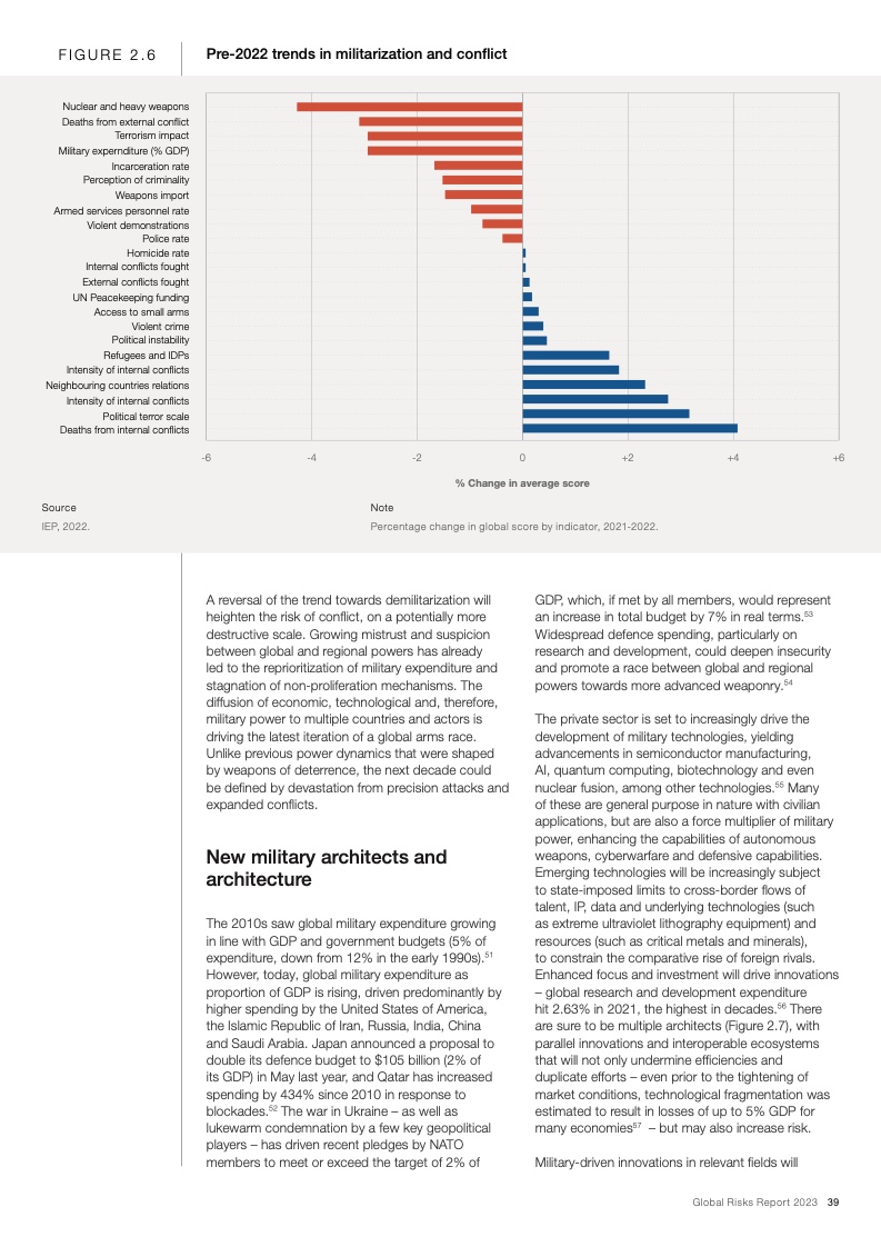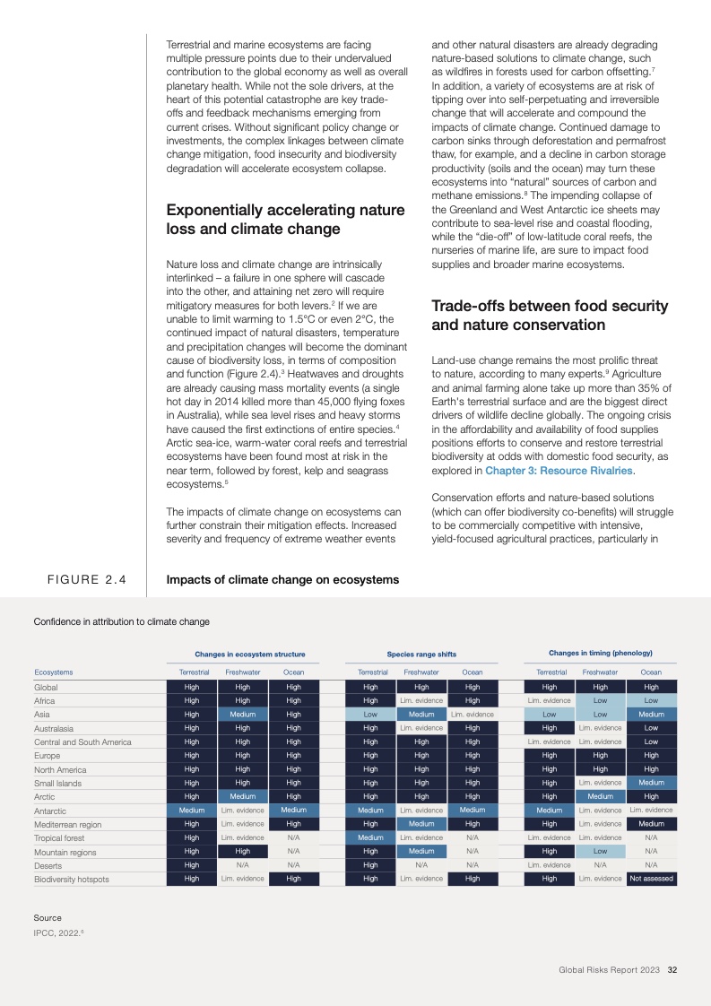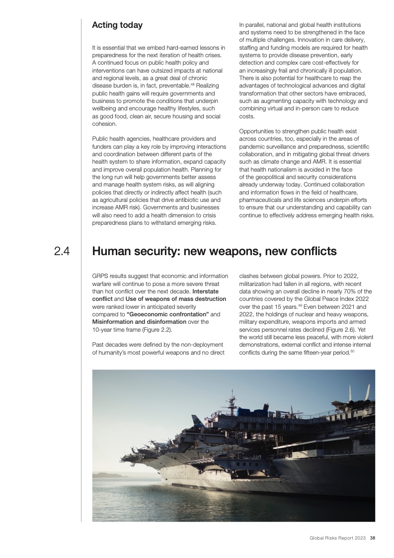 如果国际社会不能在气候减缓和气候适应领域进行更加有效的合作,那么上述风险将在未来十年导致持续的全球变暖和生态崩溃。减缓和适应气候变化的行动失败、自然灾害、生物多样性丧失和环境恶化这五项风险入选全球十大风险,而生物多样性丧失被视为未来十年快速恶化的全球性风险之一。与此同时,危机引发的领导权竞争和地缘政治对抗会导致前所未有的社会困境,再加上卫生、教育和经济发展领域的投资逐渐消失,这些都会让社会凝聚力进一步遭受削弱。最后,不断加剧的对抗还会导致地缘经济日益武器化和重新军事化,特别是在新技术和流氓行为主体的推动作用下。