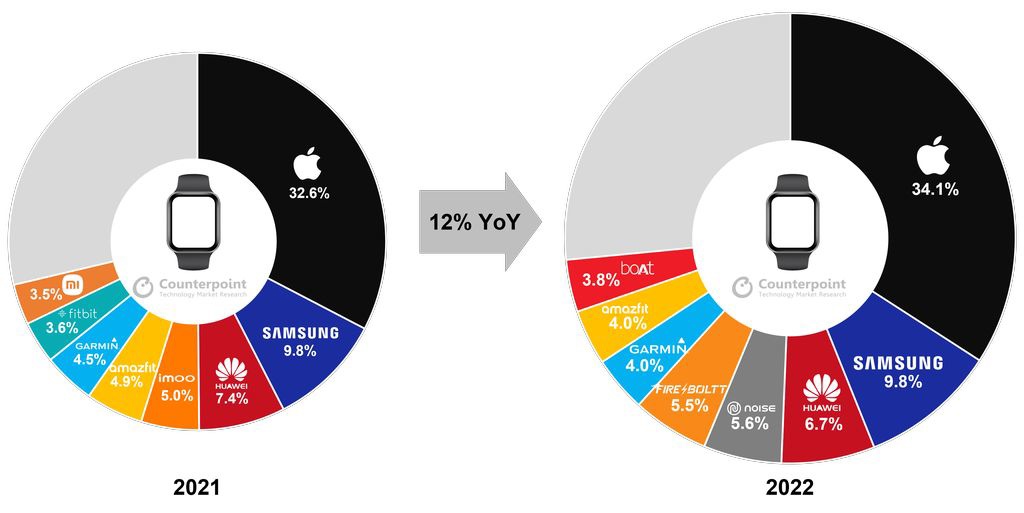 Counterpoint 预估,强劲的销售意味着 Apple Watch 在 2022 年的出货量比 2021 年增长了 17%,且进一步扩大和排名第二的三星差距。三星 2022 年的出货量同比增长约 12%,该公司占据了约 10% 的市场份额。