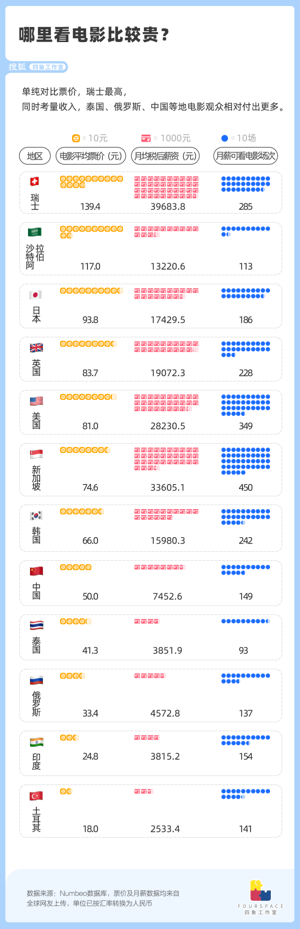 泰国平均票价虽然低一些,但用月薪只看得起93部。最幸福的应该是新加坡的朋友,平均月薪可以看高达450场电影,美国的是349场。