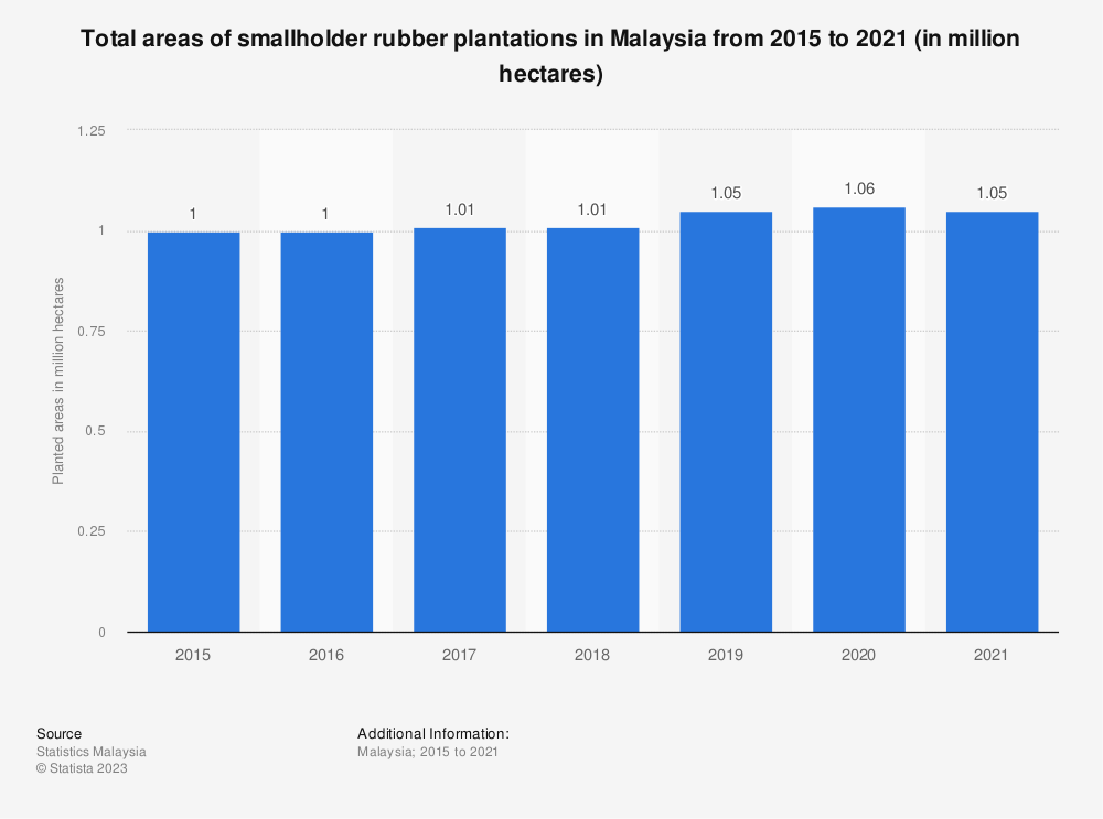 2021年,马来西亚小农橡胶种植园的总种植面积约为105万公顷,与前一年的106万公顷相比略有下降。橡胶是马来西亚的主要农产品之一,该国大部分天然橡胶是由小农生产的。