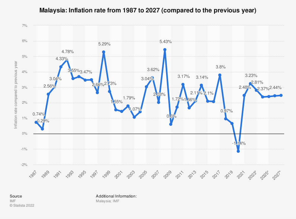 这一统计数据显示了1987年至2021年马来西亚的平均通货膨胀率,以及到2027年的预测。2021年,马来西亚的平均通货膨胀率比前一年约为2.48%。