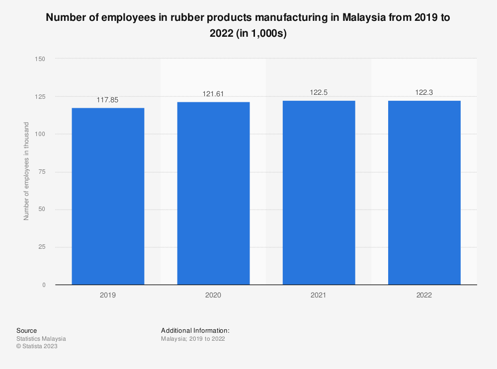 此外,对橡胶产品需求的增加为人们提供了更多制造业的就业机会。截至2022年,马来西亚有超过12.2万人在橡胶制造行业工作,与前一年相比略有下降。自2019年以来,橡胶制品制造业的员工人数一直在增加,当时约为11.8万人。