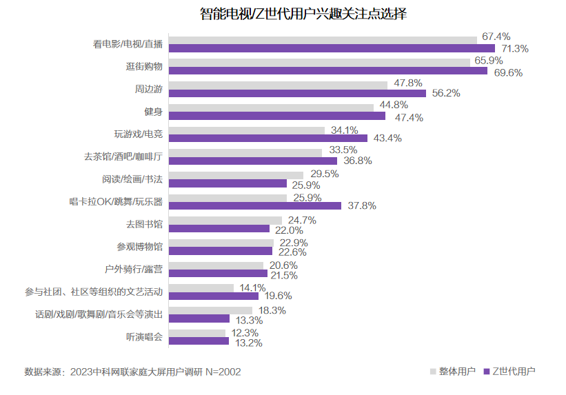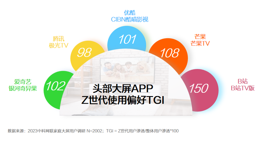 • 在智能电视端内容类APP的选择上,Z世代用户在对B站云视听小电视APP的偏好上远高于整体用户,TGI达到150。
