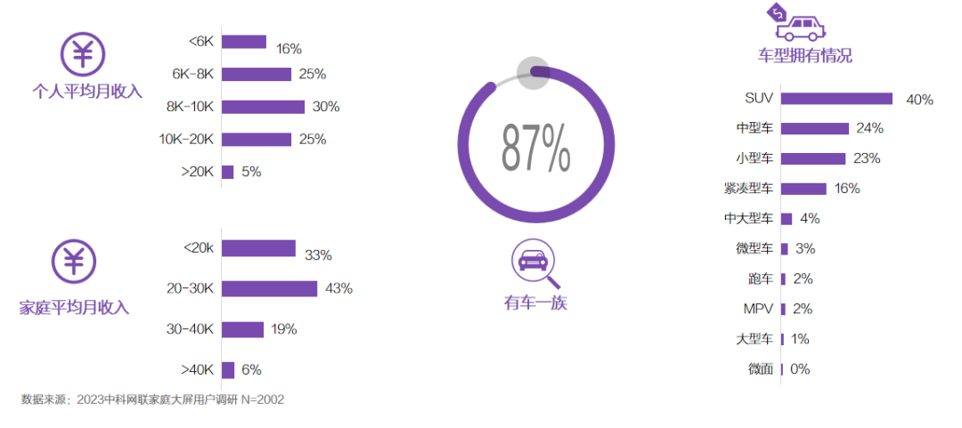 • 智能电视用户具有中高等收入水平,87%为有车一族。