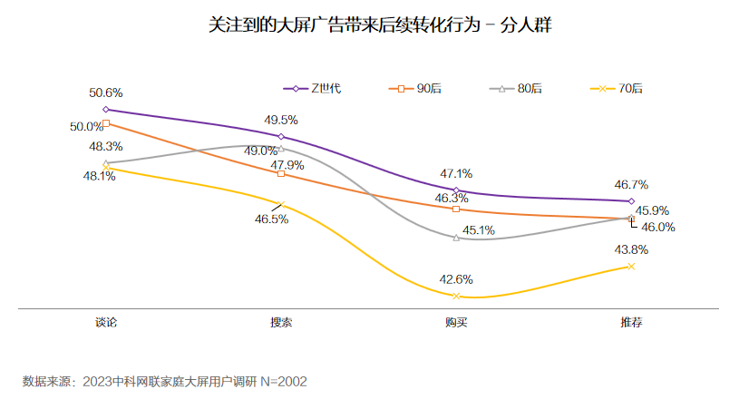 • 大屏广告的曝光对于商品后续产生的谈论、搜索、购买、推荐行为在多代际人群中超过40%。