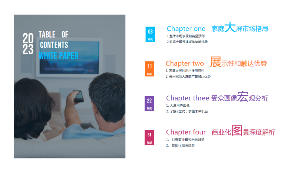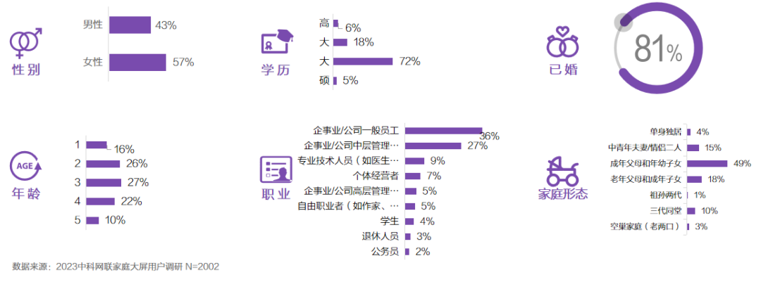 • 经过长期的市场发展和用户积累,智能电视拥有了较为庞大的用户群体,中青年、拥有本科学历、已婚群体是智能电视中占比较高的用户群体,成熟的家庭用户是智能电视的主体使用人群。