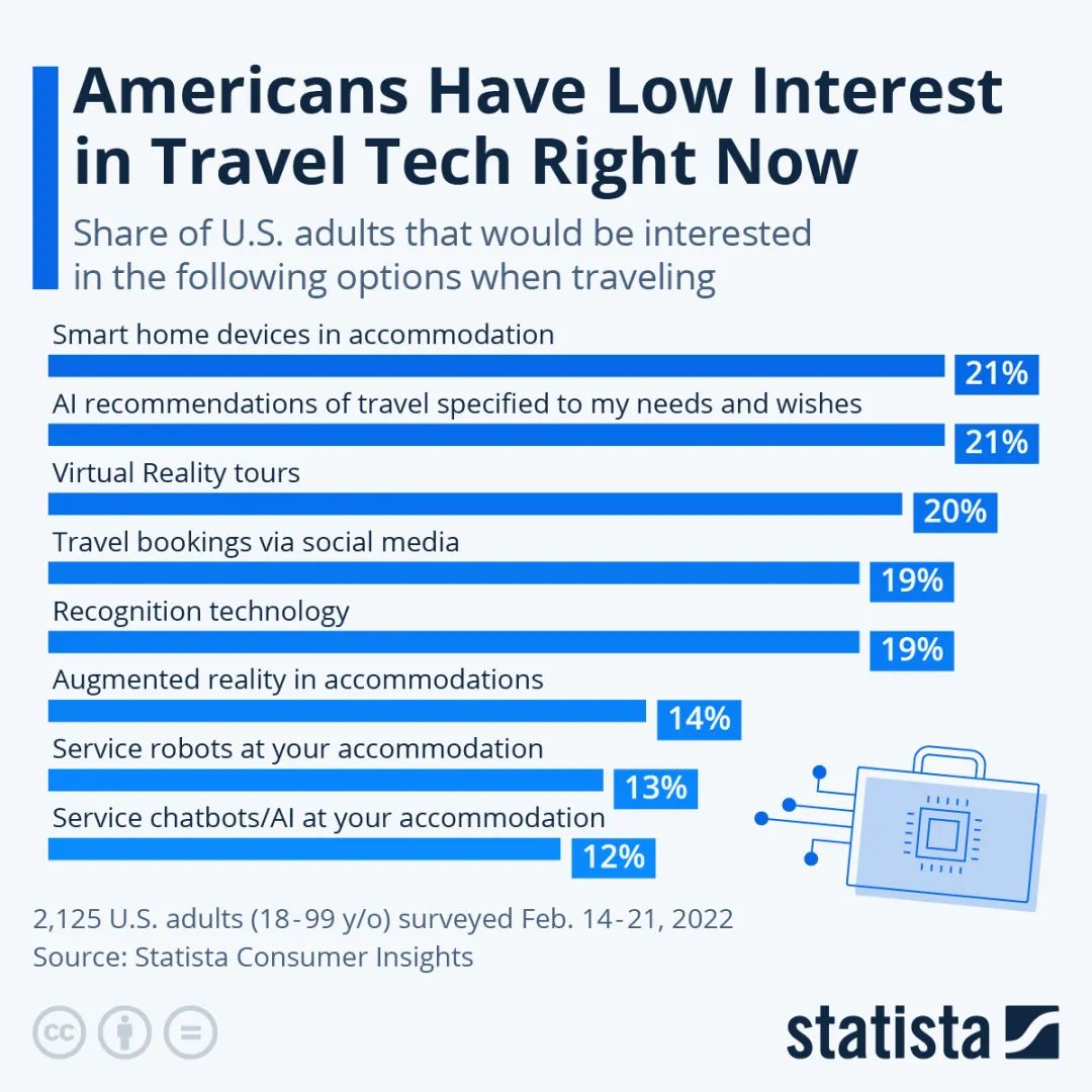 然而,正如下面的图表所示,尽管新的工具即将问世,但旅游的数字化还没有真正进入大多数美国成年人的视野。根据Statista Consumer Insights Travel & Tourism Special的数据,大约只有五分之一的受访者有兴趣在住宿中使用智能家居设备、虚拟旅游或识别技术等功能。