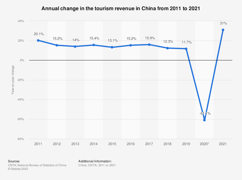 下面的数据显示了2021年之前中国旅游收入的年增长率。2021年,中国的旅游收入比前一年增长了约31%,而前一年由于冠状病毒大流行,收入大幅下降。