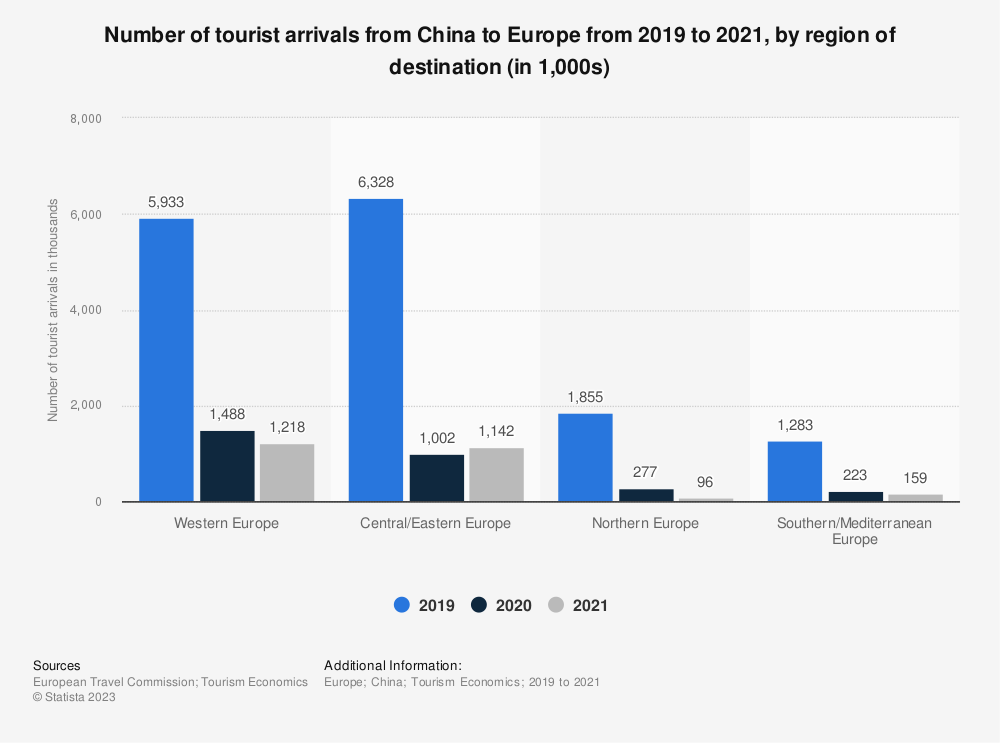 2019-2021年中国到欧洲旅游人数(按目的地地区分列)(单位:千人) 数据来源:Statista.com