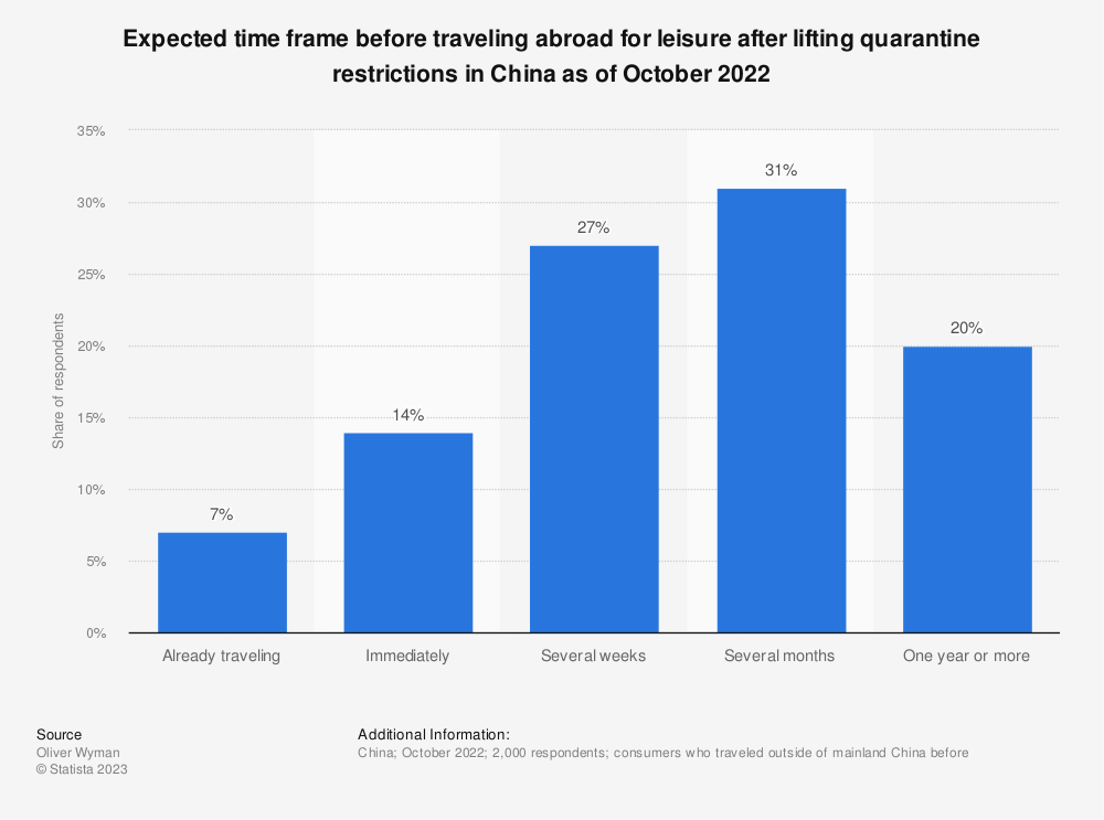 中国在关闭三年后突然决定开放国际边境,包括意大利、西班牙、英国和德国在内的一些欧洲目的地逐渐决定对来自亚洲国家的旅行者实施限制,例如需要出示疫苗接种证明或COVID-19检测结果为阴性。欧洲对中国2023年COVID-19疫情的担忧反应表明,中国旅游业的复苏可能需要一段时间。2022年10月的一项研究显示,在中国所有隔离限制解除后,超过一半的受访中国消费者预计不会很快出国旅游休闲。虽然31%的受访者认为出国旅行需要几个月的时间,但十分之二的受访者提到了至少一年的时间。相比之下,21%的受访者表示,他们已经开始出境休闲旅行,或计划在限制解除后立即重新开始旅行。