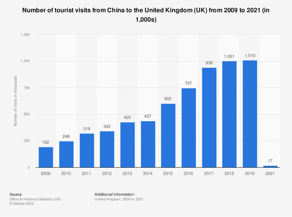 受新冠肺炎疫情影响,2021年中国赴英国旅游人数较2019年大幅下降。尽管2019年中国入境游客达到100多万人次的峰值,但2021年降至仅1.7万人次,为2009年以来的最低水平。