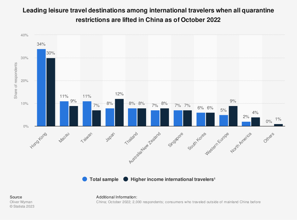 根据2022年10月对中国国际游客进行的一项研究,约三分之一的受访者表示,在中国取消所有隔离限制后,香港是首选的旅游目的地。虽然只有5%的受访者选择了西欧,但在接受调查的中国高收入国际旅行者中,有9%的人提到了西欧。