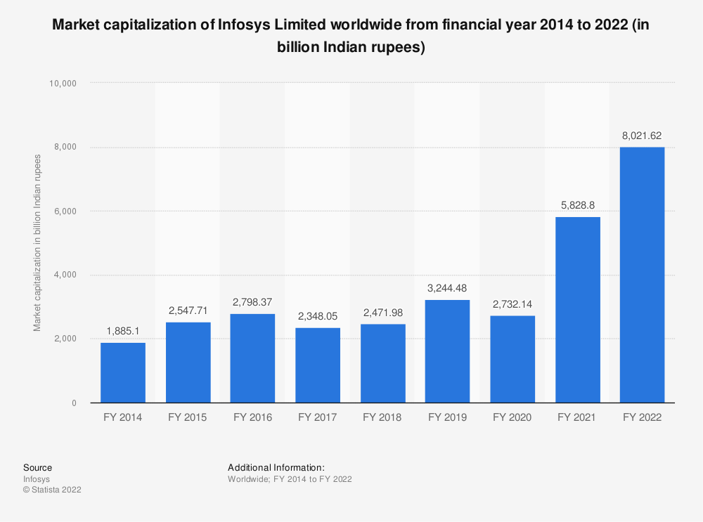 Infosys是一家印度的跨国公司,提供数字和咨询服务。它由七名工程师于1981年在浦那成立,初始资本为250美元。1993年,它成为印度的一家上市公司,其股票于1999年在纳斯达克证券交易所上市。截至2022财政年度,Infosys的市值约为8万亿印度卢比。与前一年相比,这是一个巨大的增长。在此期间,可以观察到不断增加的趋势。