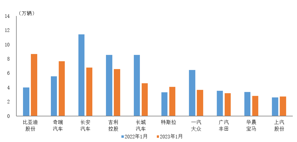 中国汽车工业协会:2023年1月前十家SUV生产企业销售情况简析 据中国汽车工业协会统计分析,2023年1月,销量排名前十位的SUV生产企业共销售51万辆,占SUV销售总量的67.2%。 在上述十家企业中,与上年同期相比,比亚迪股份增速最为显著,奇瑞汽车和特斯拉呈两位数增长,上汽股份小幅增长,其他企业呈不同程度下降。 更多阅读:中国汽车工业协会:2022年1-11月销量排名前十位的SUV生产企业共销售580.2万辆中国汽车工业协会:2023年1-2月前十家SUV生产企业销售情况简析中国汽车工业协会:2022年1-8月销量排名前十位的SUV生产企业共销售395.2万辆中国汽车工业协会:2022年1-9月前十家SUV生产企业销售情况简析中国汽车工业协会:2022年1-5月前十家SUV生产企业销售情况简析中国汽车工业协会:2022年1-4月前十家SUV生产企业销量情况简析中国汽车工业协会:2023年1-3月前十位SUV生产企业销售情况简析中国汽车工业协会:2024年1-6月前十位SUV生产企业销售情况简析中国汽车工业协会:2023年1-2月我国汽车商品出口金额前十国情况简析中国汽车工业协会:2022年3月前十位轿车品牌销量排名中国汽车工业协会:2021年5月汽车工业运行情况简述中汽协:2024年1-4月前十位SUV生产企业销售情况简析中汽协:2024年1-5月前十位SUV生产企业销售情况简析中汽协:2021年上半年销量前十SUV生产企业简析中国汽车工业协会:2023年1-8月汽车制造业工业增加值保持较快增长