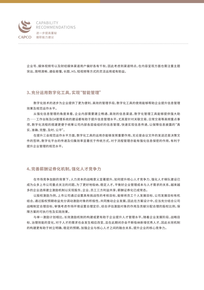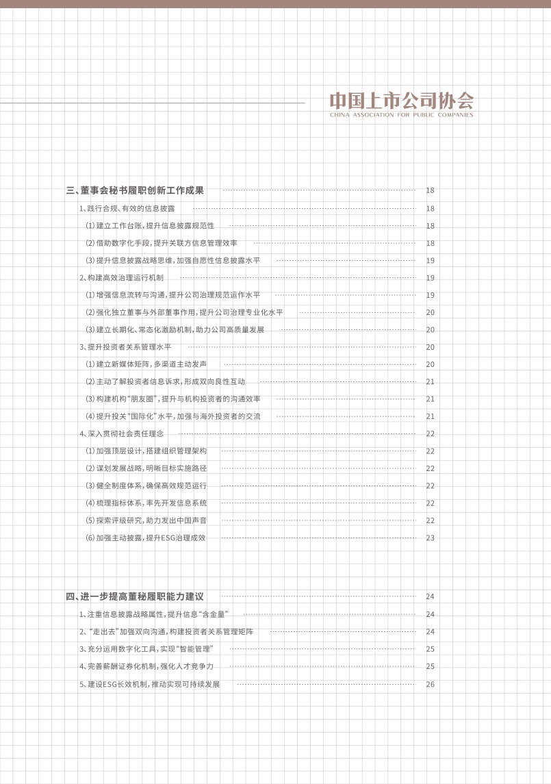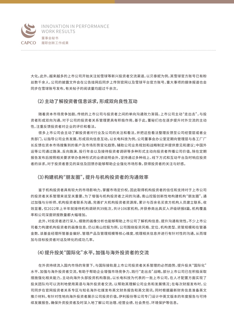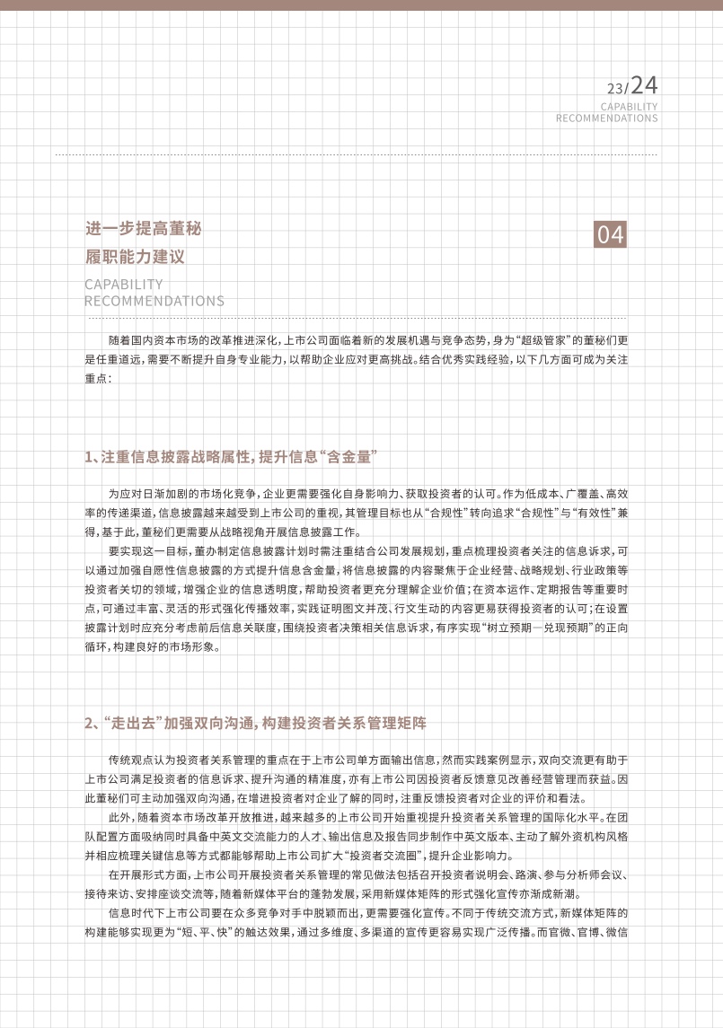 随着国内资本市场的改革推进深化,上市公司面临着新的发展机遇与竞争态势,身为“超级管家”的董秘们更是任重道远,需要不断提升自身专业能力,以帮助企业应对更高挑战。报告对进一步提高董秘履职能力提出了建议,报告指出董秘应当更加注重信息披露的战略属性,提升信息“含金量”,加强与投资者的双向沟通,构建投资者关系管理矩阵,充分运用数字化工具,实现智能管理,完善薪酬证券化机制,强化人才竞争力,建设ESG长效机制,推动实现可持续发展。