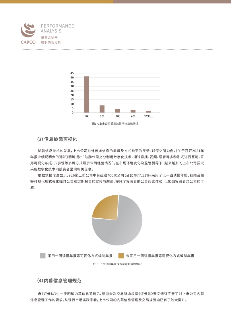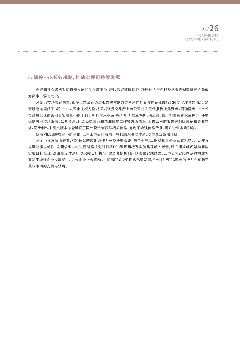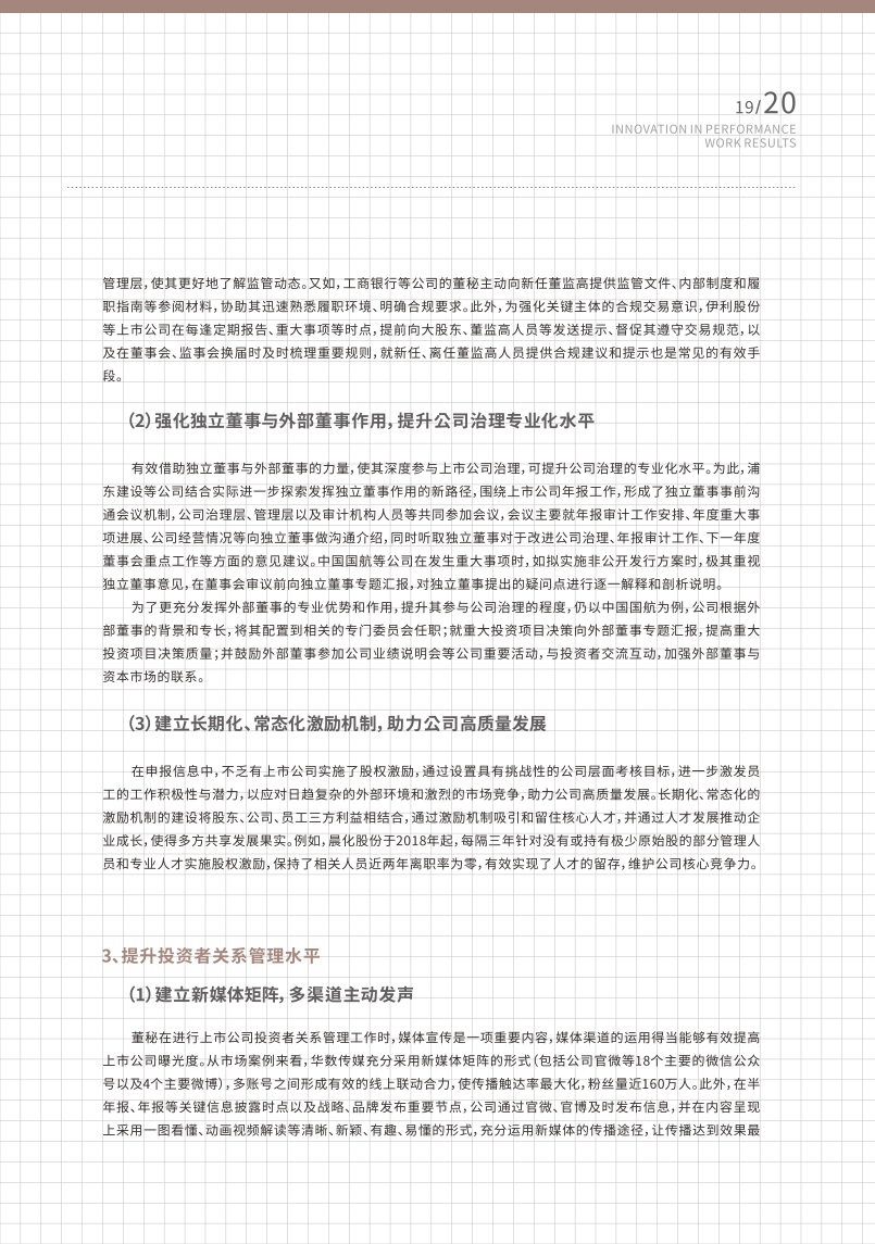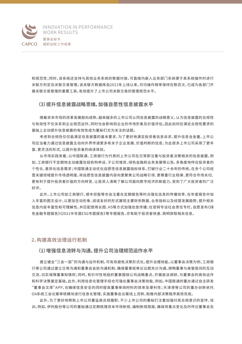 随着国内资本市场的改革推进深化,上市公司面临着新的发展机遇与竞争态势,身为“超级管家”的董秘们更是任重道远,需要不断提升自身专业能力,以帮助企业应对更高挑战。报告对进一步提高董秘履职能力提出了建议,报告指出董秘应当更加注重信息披露的战略属性,提升信息“含金量”,加强与投资者的双向沟通,构建投资者关系管理矩阵,充分运用数字化工具,实现智能管理,完善薪酬证券化机制,强化人才竞争力,建设ESG长效机制,推动实现可持续发展。